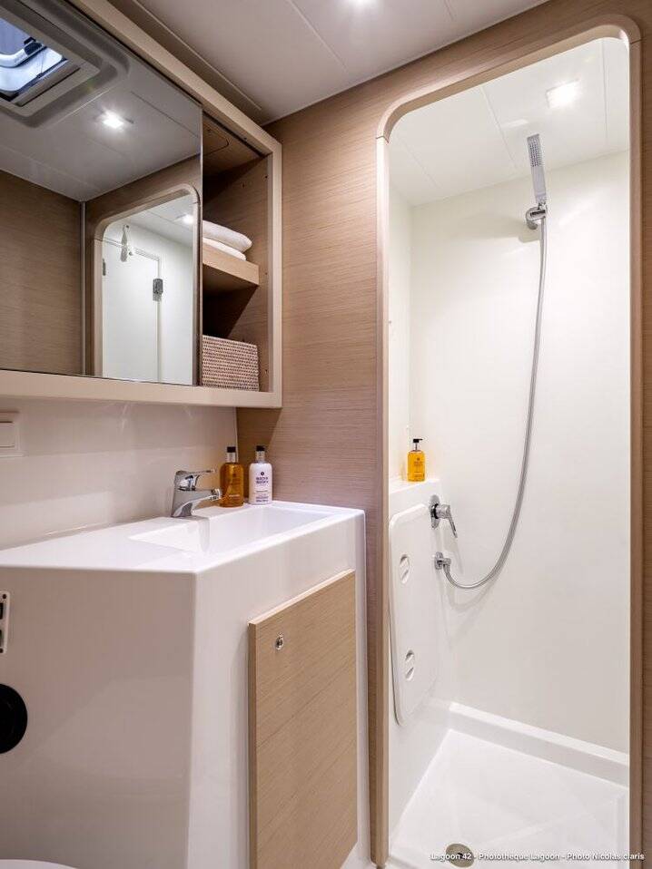 Catamaran Lagoon 42 Pirelli, built in 2023 is anchored in the BVI, Tortola, Ritter House Marina, British Virgin Islands, British Virgin Islands. It has 4 + 2 cabins, can accommodate 8 + 2 + 2 people and has 4 toilets. Bed linen and kitchen equipment are included in the price.