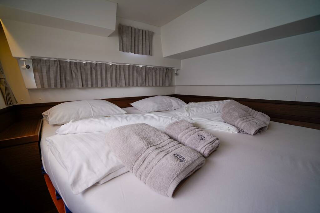 Catamaran Lagoon 42 Vesper, built in 2021 is anchored in the Trogir, Yachtclub Seget (Marina Baotić), Split region, Croatia. It has 4 + 2 cabins, can accommodate 8 + 2 + 2 people and has 4 toilets. Bed linen and kitchen equipment are included in the price.