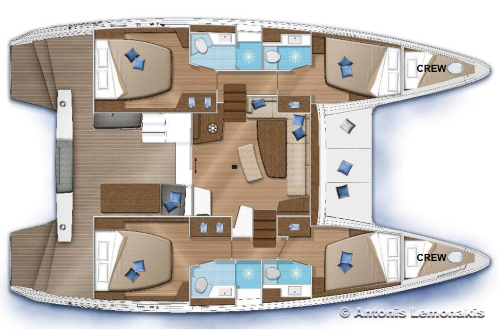 Catamaran Lagoon 42 Winny, built in 2019 is anchored in the Syros, Cyclades, Greece. It has 3 + 2 cabins, can accommodate 6 + 2 people and has 3 + 2 toilets. Bed linen and kitchen equipment are included in the price.