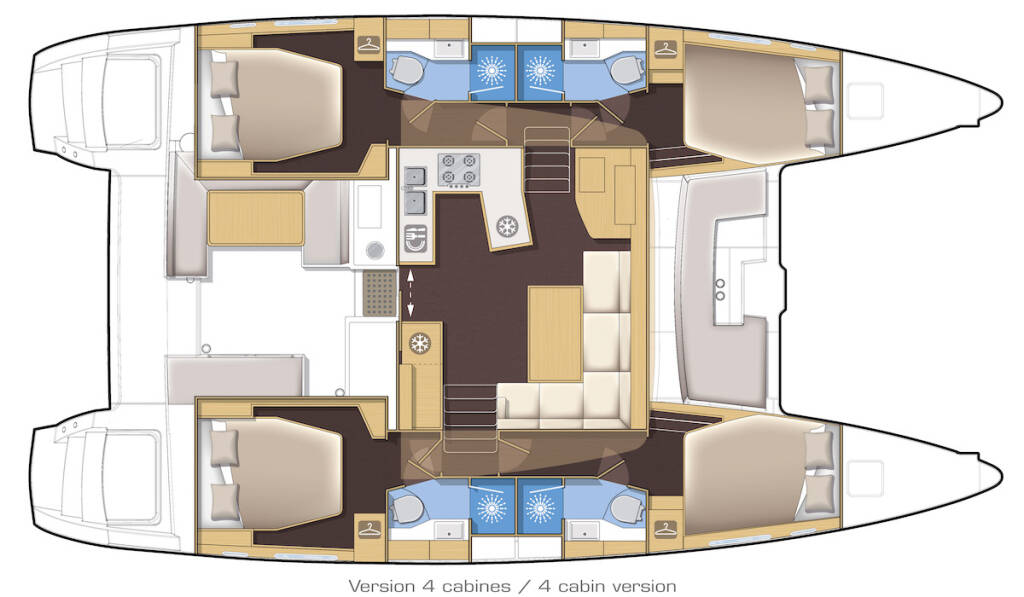Catamaran Lagoon 450 Anabella, built in 2017 is anchored in the Palma de Mallorca, La Lonja, Balearic Islands, Spain. It has 4 + 2 cabins, can accommodate 8 + 2 + 2 people and has 4 toilets. Bed linen and kitchen equipment are included in the price.
