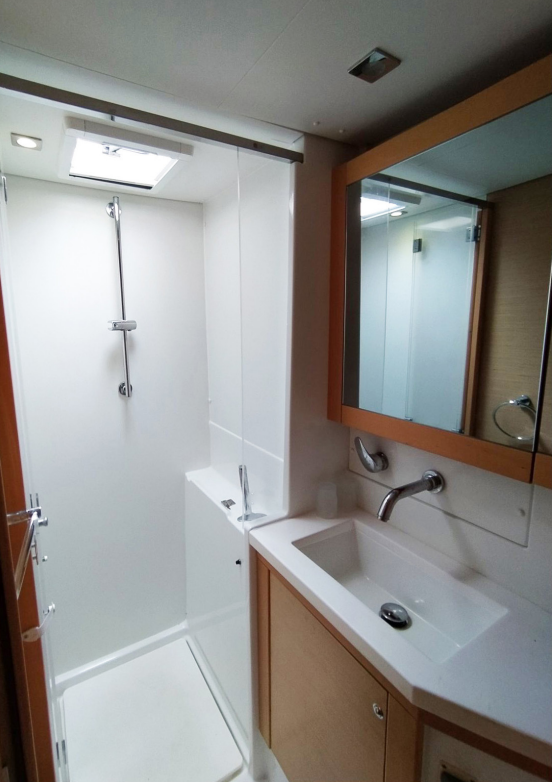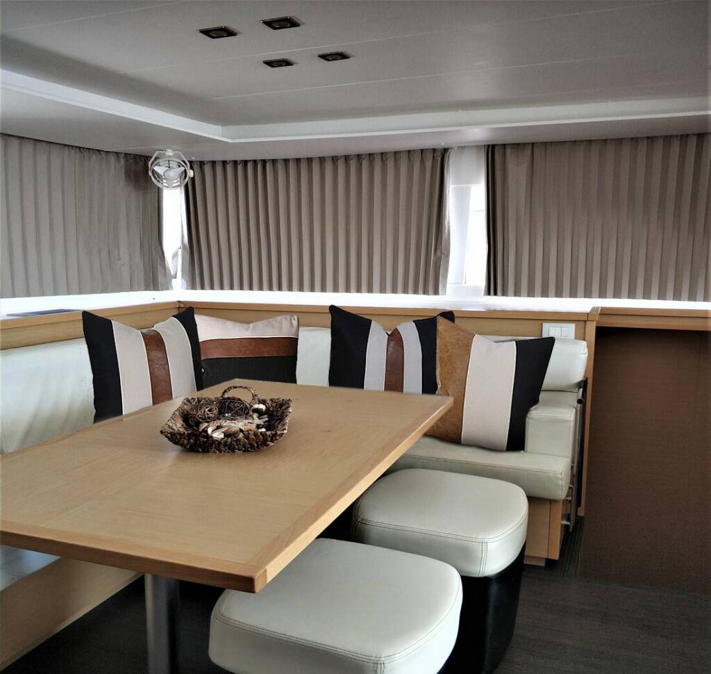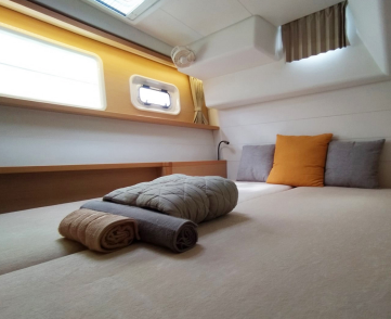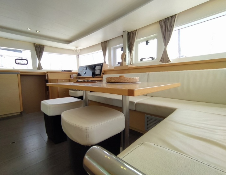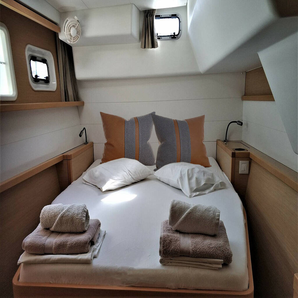Catamaran Lagoon 450 F Azraq, built in 2015 is anchored in the Athens, Alimos marina, Athens area/Saronic/Peloponese, Greece. It has 4 + 2 cabins, can accommodate 8 + 2 people and has 4 + 1 toilets. Bed linen and kitchen equipment are included in the price.