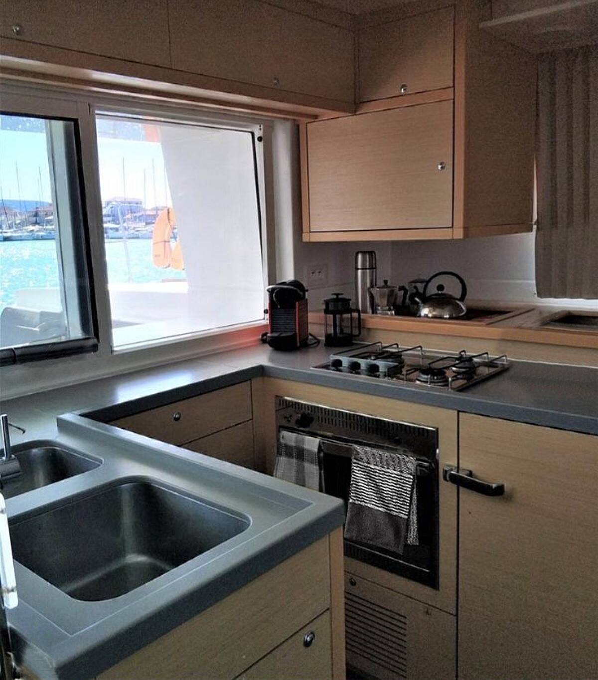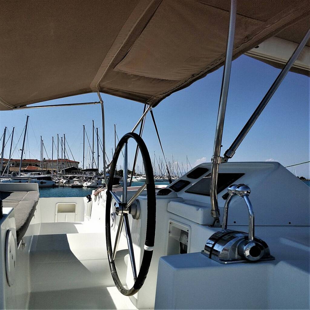 Catamaran Lagoon 450 F Azraq, built in 2015 is anchored in the Athens, Alimos marina, Athens area/Saronic/Peloponese, Greece. It has 4 + 2 cabins, can accommodate 8 + 2 people and has 4 toilets. Bed linen and kitchen equipment are included in the price.
