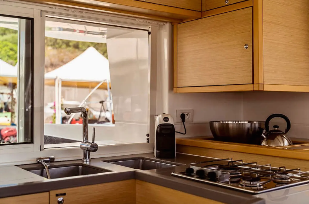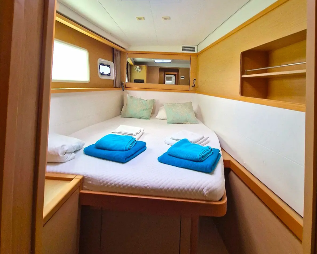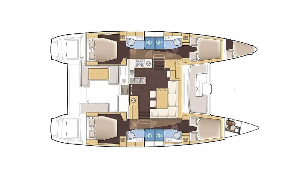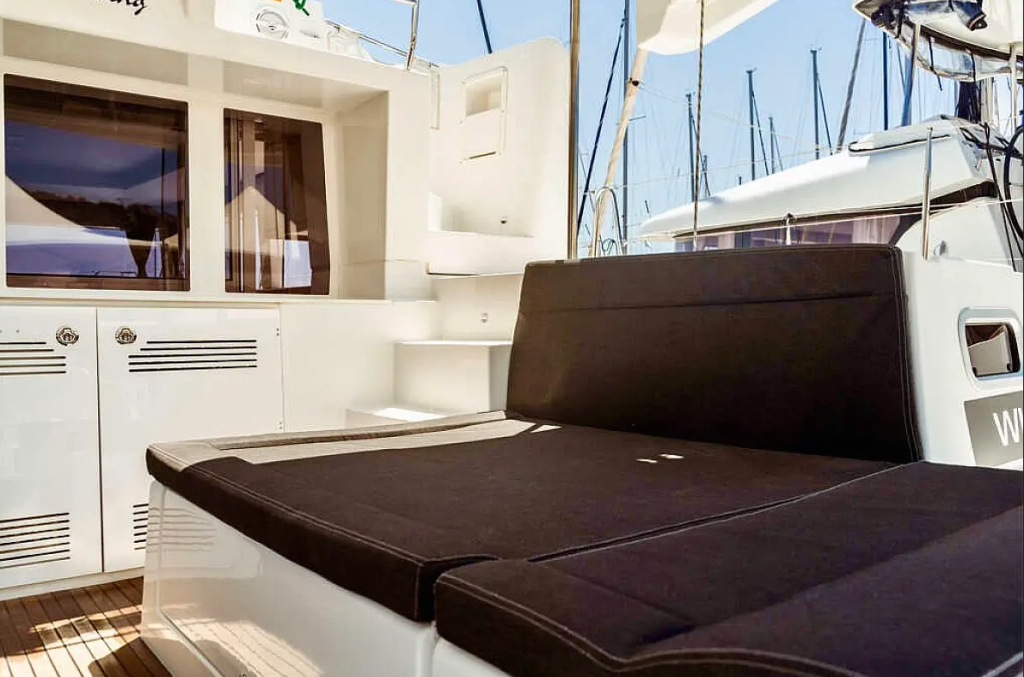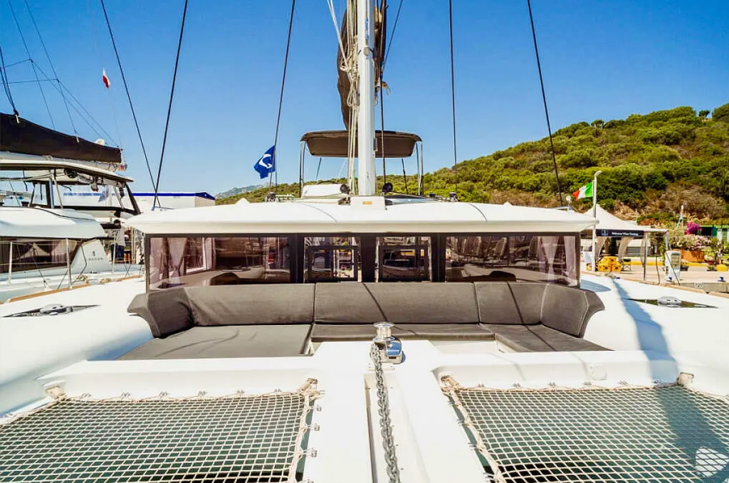 Catamaran Lagoon 450 F Emoseaon, built in 2018 is anchored in the Lefkas, D-Marin, Ionian Islands, Greece. It has 4 + 1 cabins, can accommodate 8 + 1 people and has 4 + 1 toilets. Bed linen and kitchen equipment are included in the price.