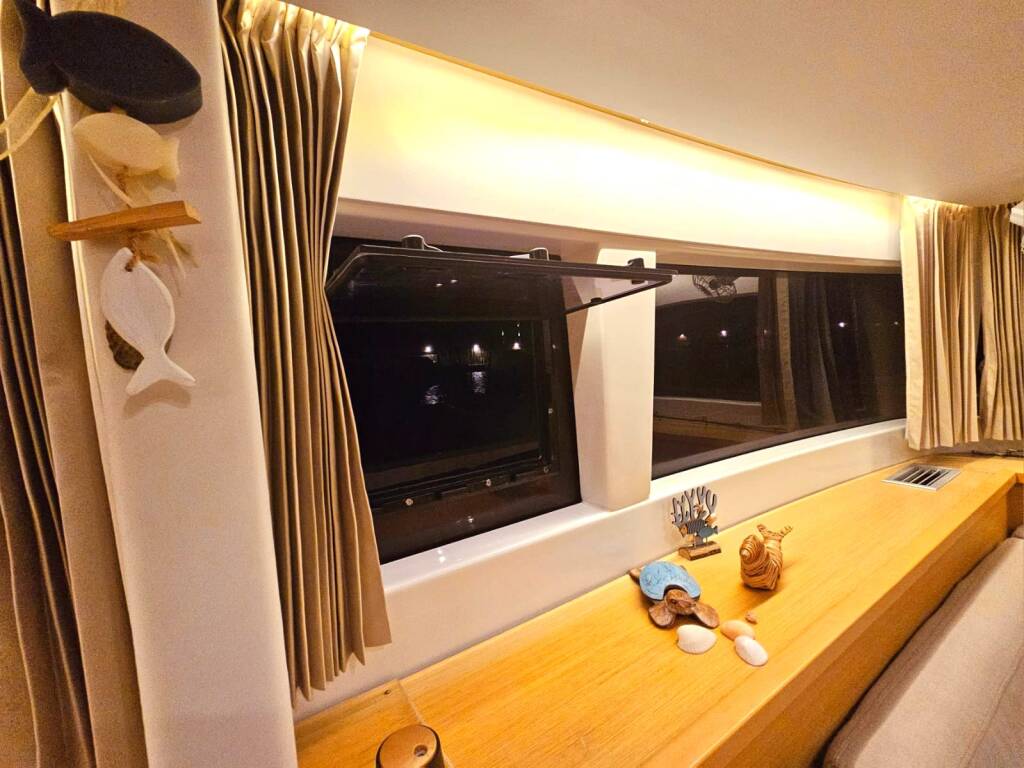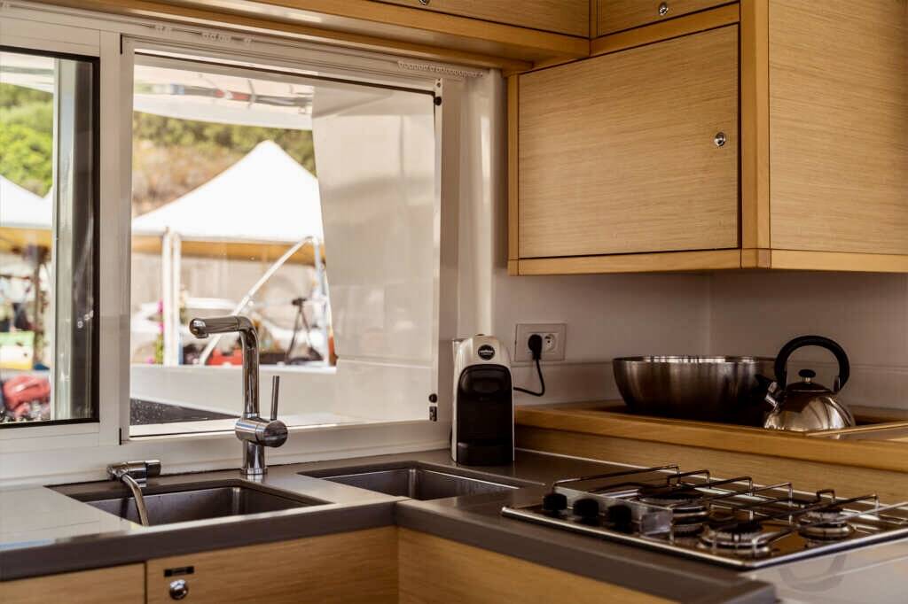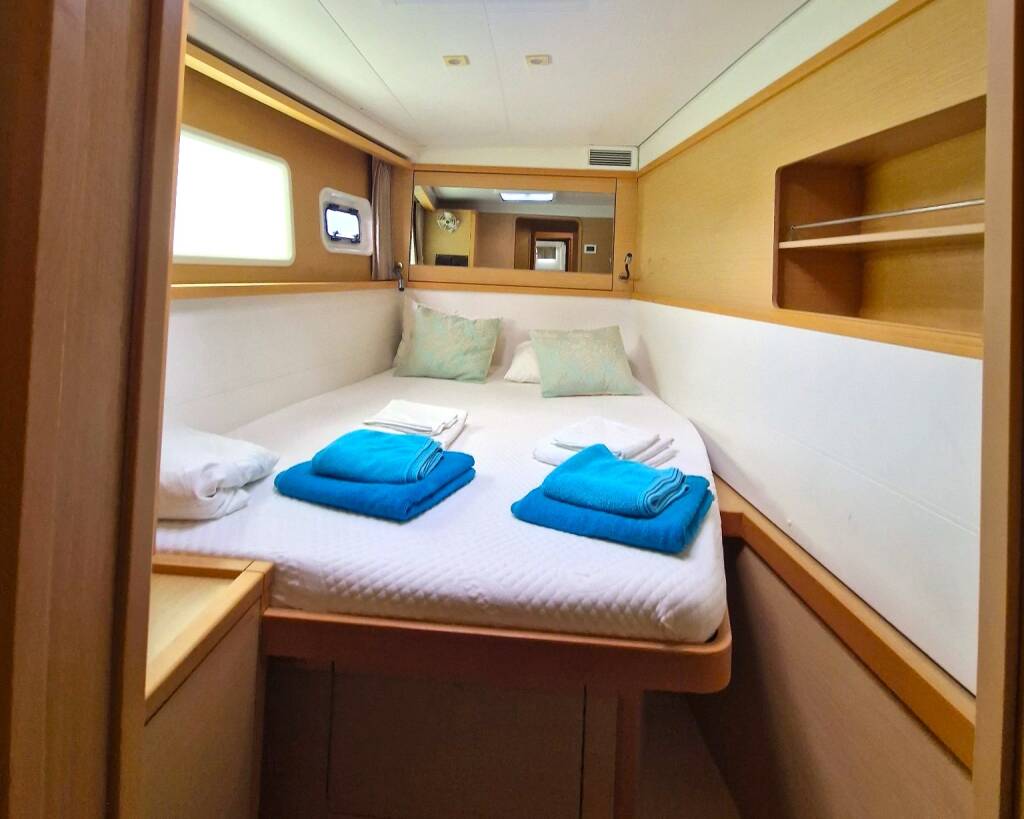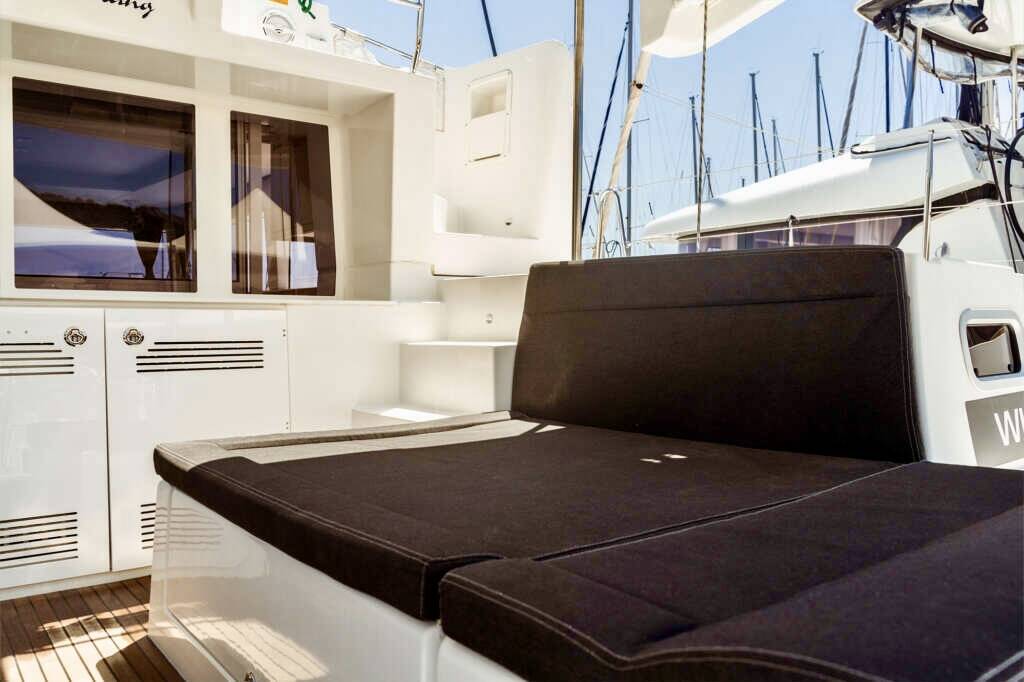 Catamaran Lagoon 450 F EmoSEAon, built in 2018 is anchored in the Lefkas, D-Marin, Ionian Islands, Greece. It has 4 + 1 cabins, can accommodate 10 + 2 people and has 4 + 1 toilets. Bed linen and kitchen equipment are included in the price.