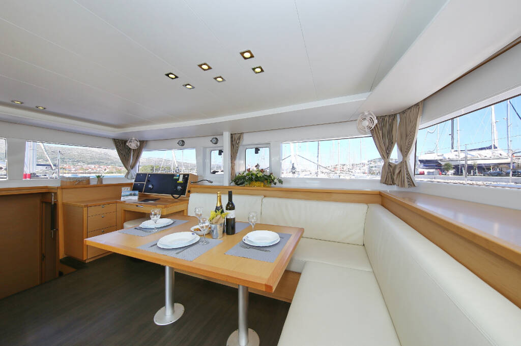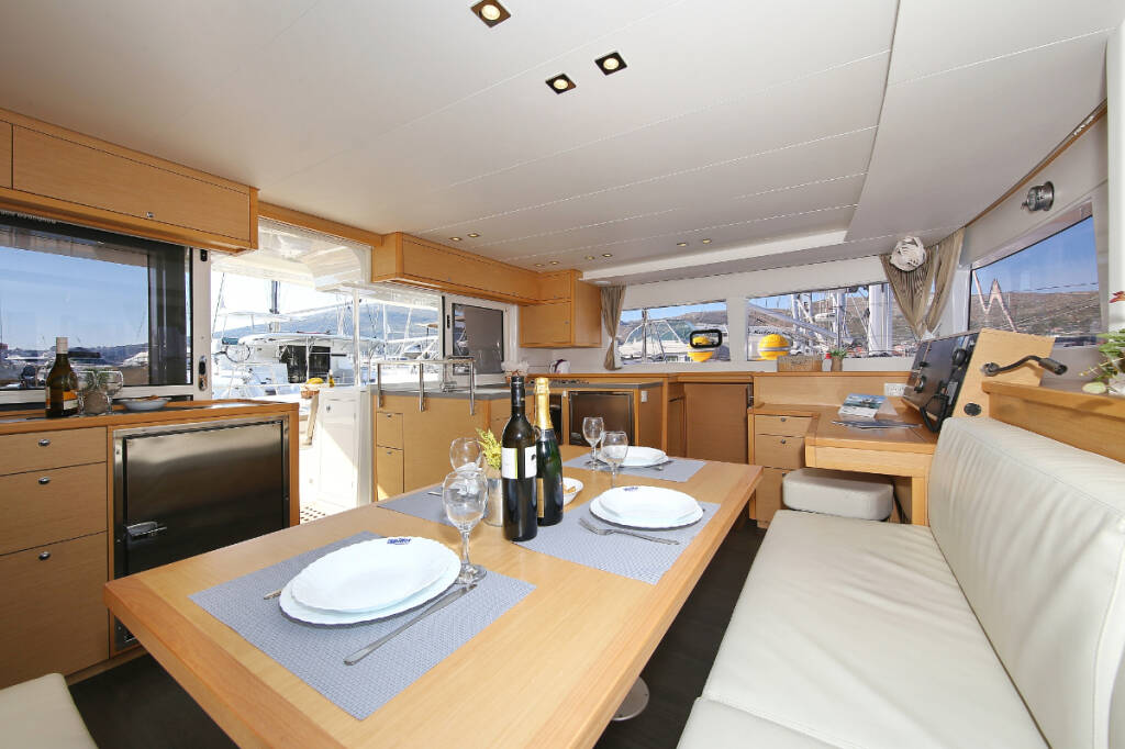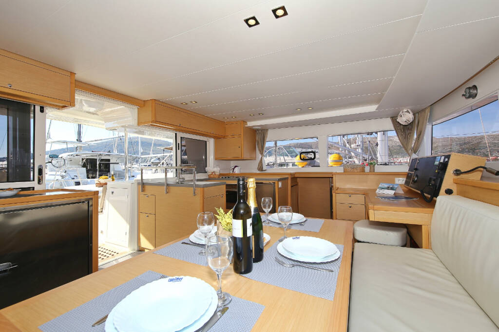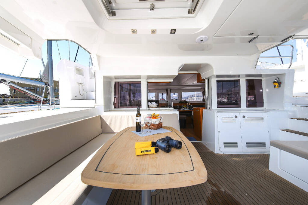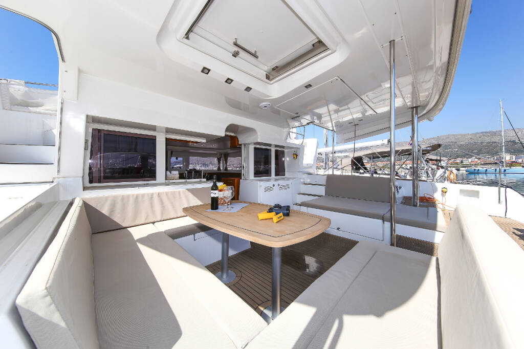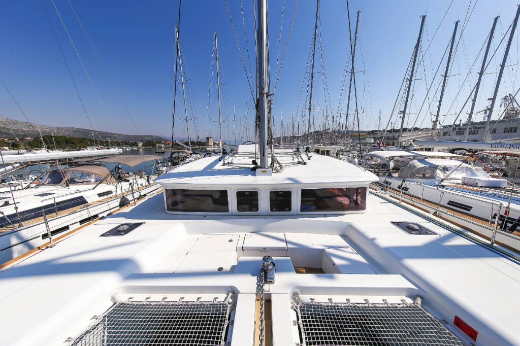 Catamaran Lagoon 450 F Fenadi, built in 2015 is anchored in the Trogir, Marina Trogir (ex.SCT), Split region, Croatia. It has 4 + 2 cabins, can accommodate 8 + 2 + 2 people and has 4 toilets. Bed linen and kitchen equipment are included in the price.