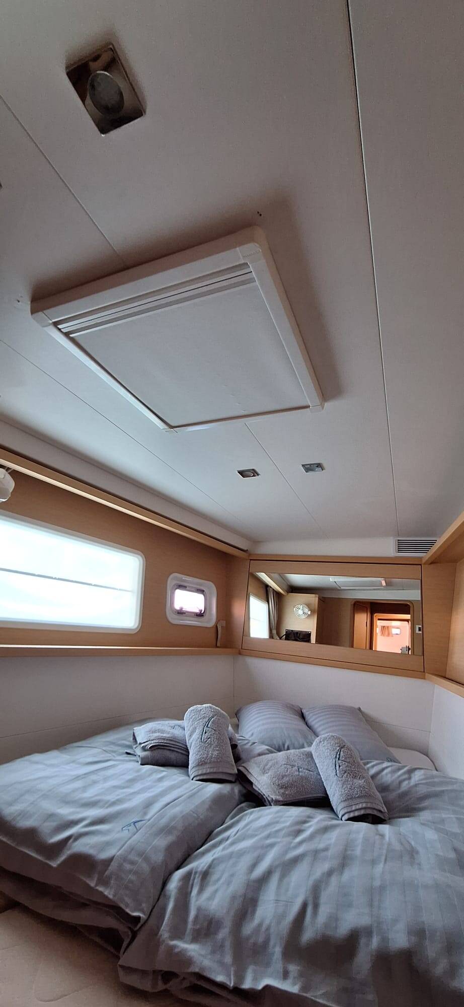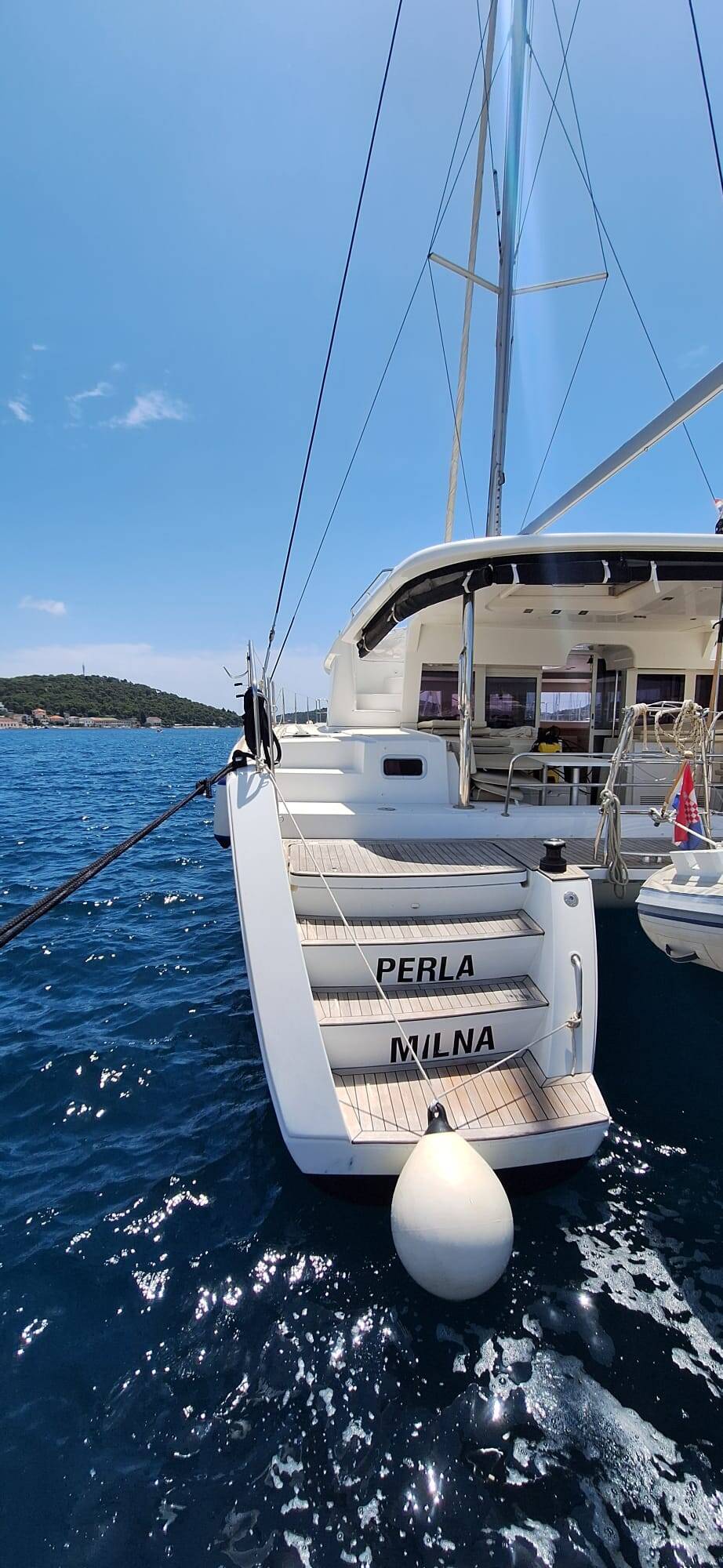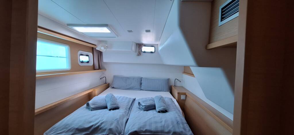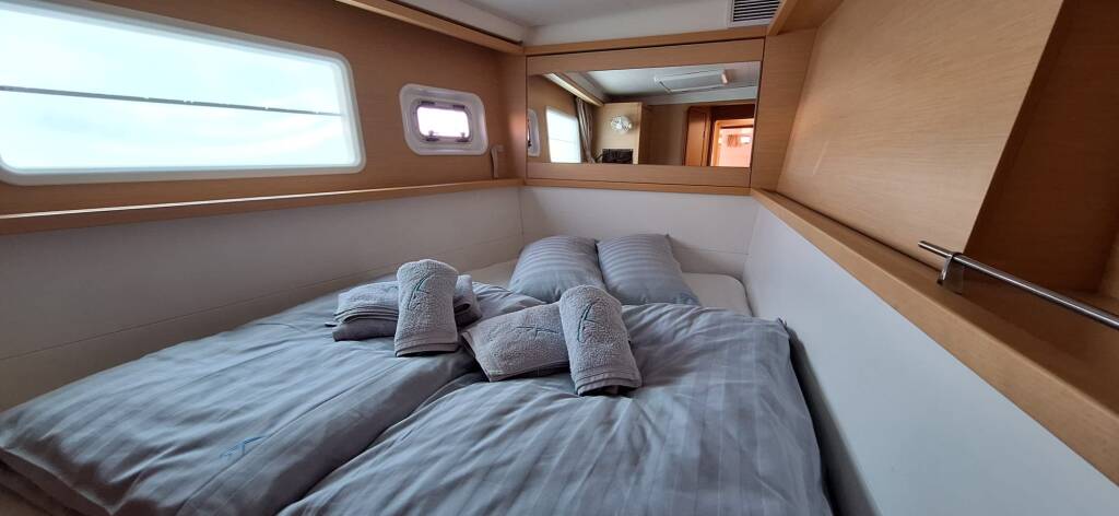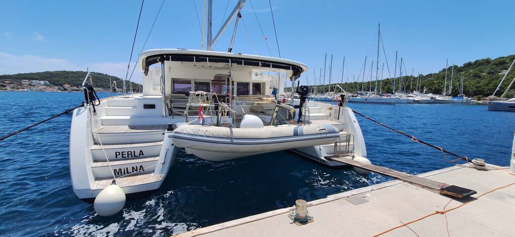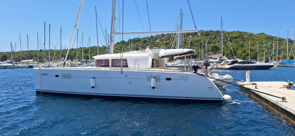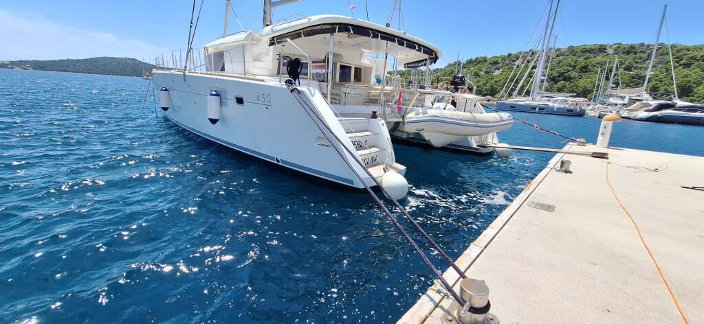 Catamaran Lagoon 450 Perla, built in 2013 is anchored in the Marina Frapa, Rogoznica, Šibenik region, Croatia. It has 4 + 2 cabins, can accommodate 8 + 1 + 1 people and has 4 toilets. Bed linen and kitchen equipment are included in the price.