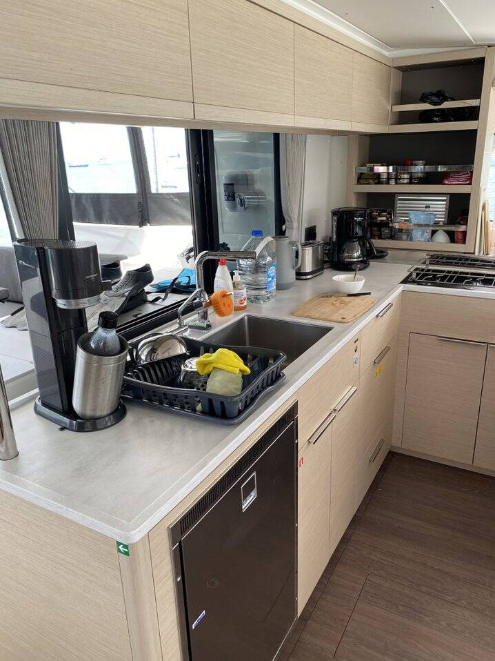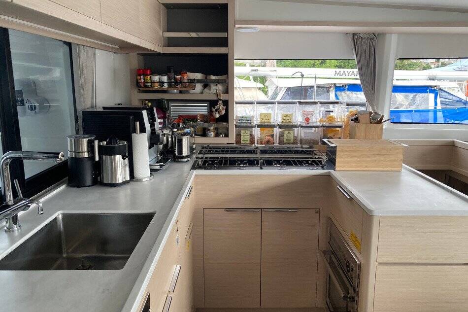 Catamaran Lagoon 46 Bugaboo, built in 2022 is anchored in the Martinique, Le Marin, Martinique, Caribbean. It has 3 cabins, can accommodate 6 people and has 3 toilets. Bed linen and kitchen equipment are included in the price.