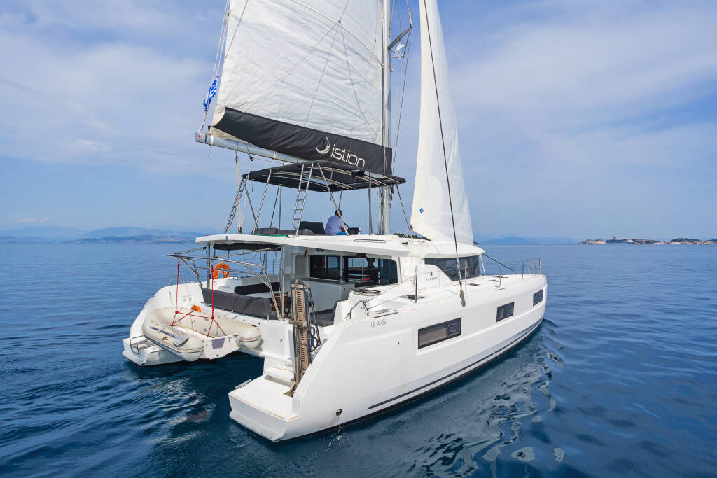 Catamaran Lagoon 46 If, built in 2021 is anchored in the Corfu, Gouvia Marina, Ionian Islands, Greece. It has 4 + 2 cabins, can accommodate 8 + 2 people and has 4 + 1 toilets. Bed linen and kitchen equipment are included in the price.