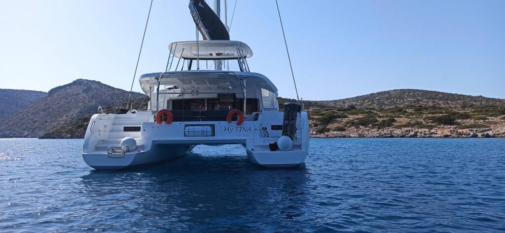 Catamaran Lagoon 46 My Tina, built in 2020 is anchored in the Corfu, Gouvia Marina, Ionian Islands, Greece. It has 4 + 1 cabins, can accommodate 8 + 2 + 2 people and has 4 + 1 toilets. Bed linen and kitchen equipment are included in the price.
