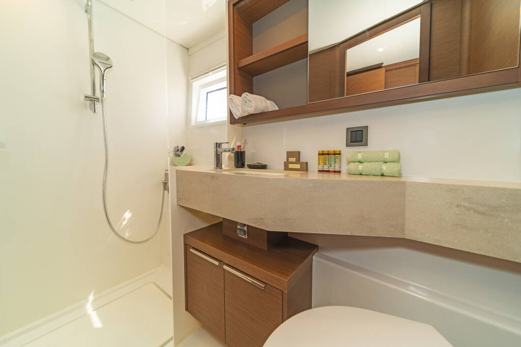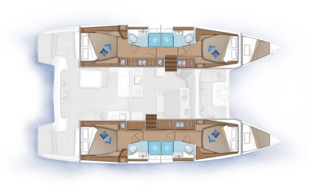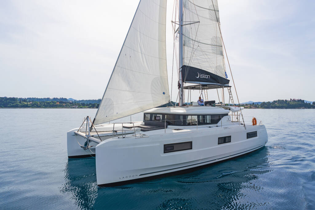 Catamaran Lagoon 46 No Worries, built in 2021 is anchored in the Rhodes New Marina, Dodecanese, Greece. It has 4 + 2 cabins, can accommodate 8 + 2 + 2 people and has 4 + 1 toilets. Bed linen and kitchen equipment are included in the price.
