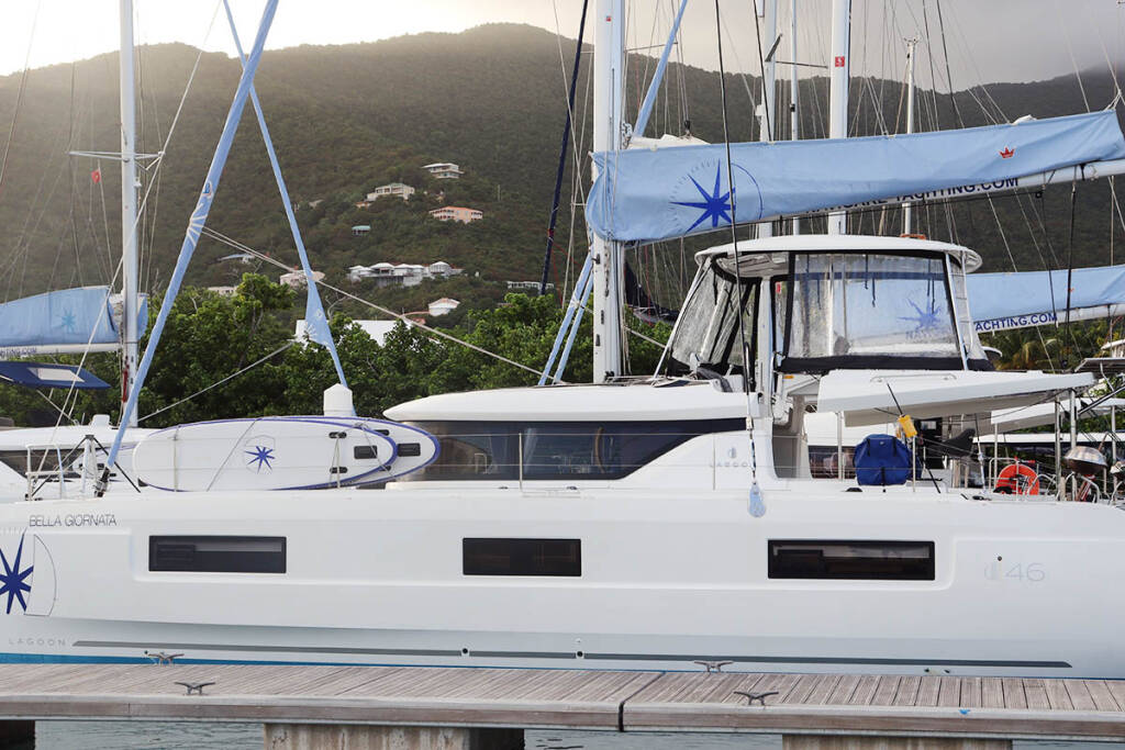 Catamaran Lagoon 46 OW Bella Giornata, built in 2023 is anchored in the Marsh Harbour, Conch Inn Marina, Abaco Islands, Bahamas. It has 3 cabins, can accommodate 6 + 2 people and has 3 toilets. Bed linen and kitchen equipment are included in the price.