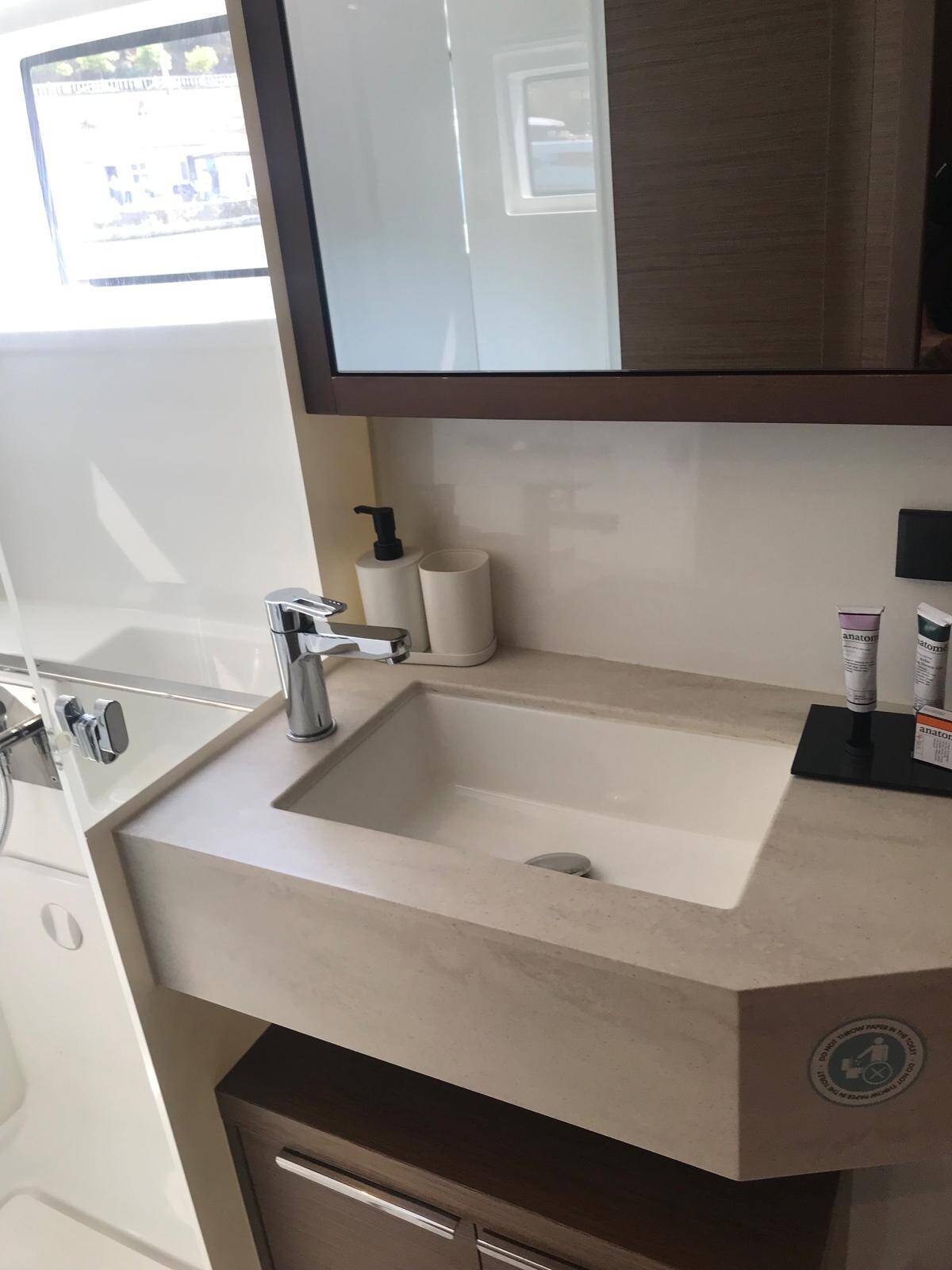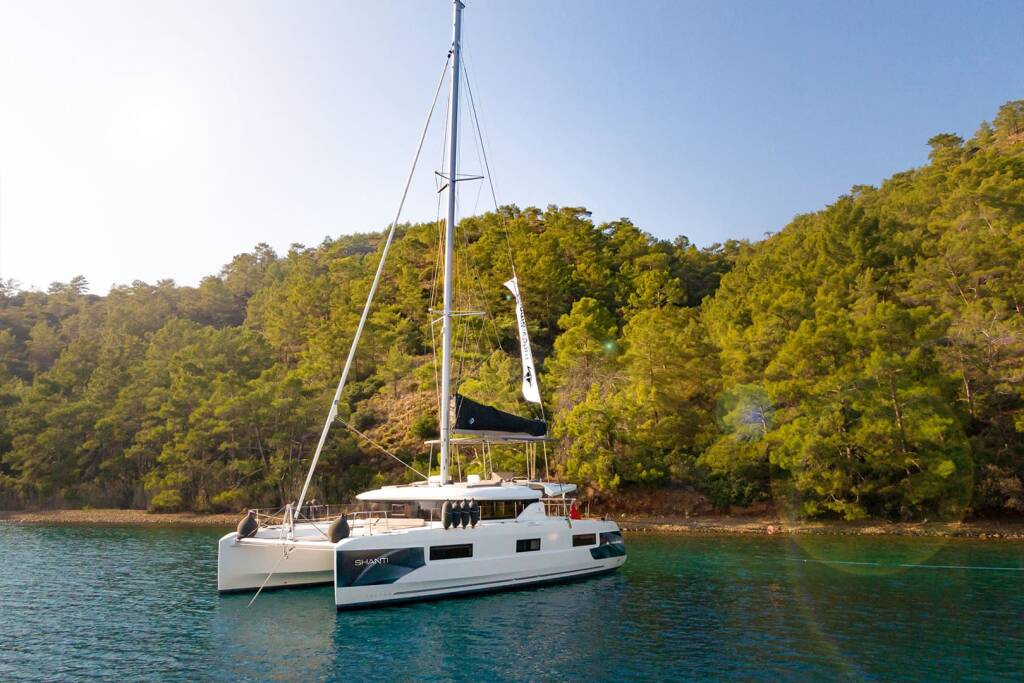 Catamaran Lagoon 46 Shanti, built in 2020 is anchored in the Fethiye, Yacht Club Mai, Aegean, Turkey. It has 4 + 1 cabins, can accommodate 8 + 1 people and has 4 toilets. Bed linen and kitchen equipment are included in the price.