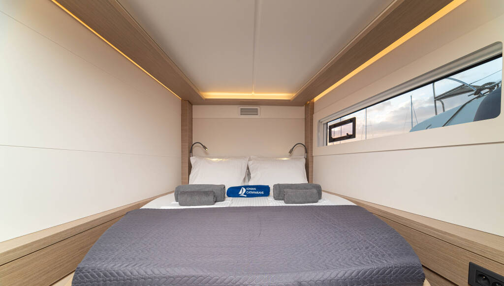 Catamaran Lagoon 46 Spiritus, built in 2023 is anchored in the Lefkas main port, Ionian Islands, Greece. It has 4 + 2 cabins, can accommodate 8 + 2 + 2 people and has 4 + 1 toilets. Bed linen and kitchen equipment are included in the price.