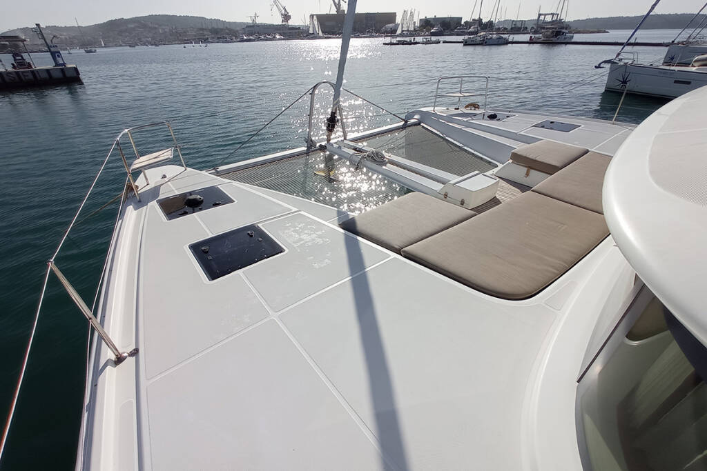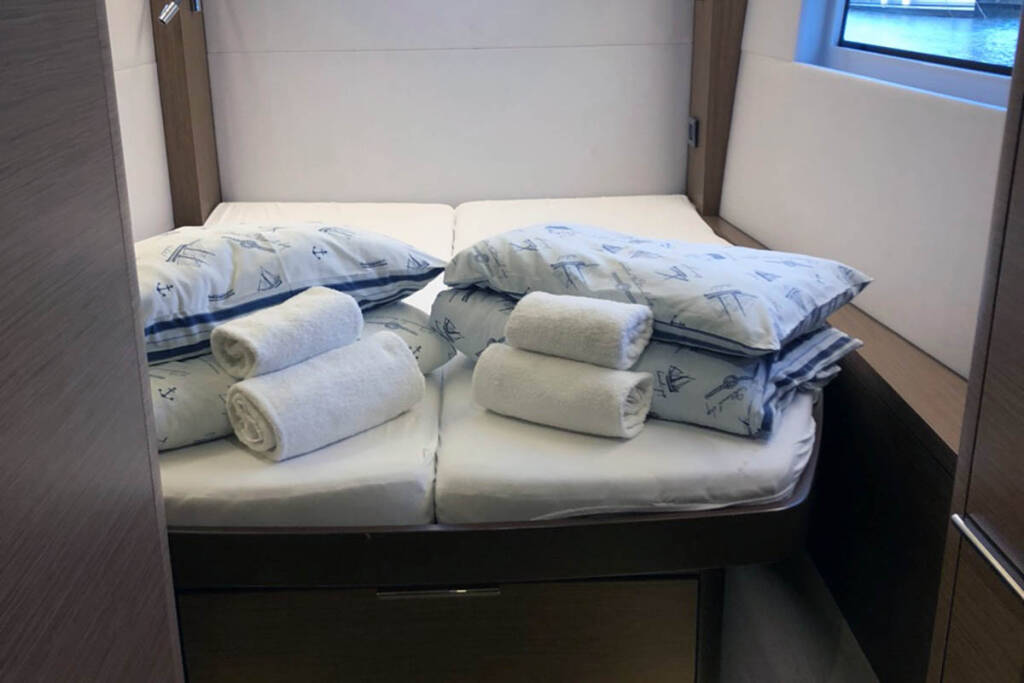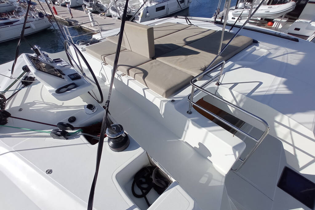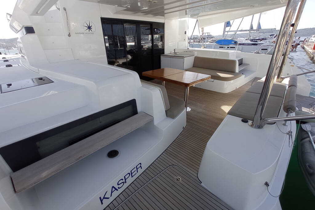Catamaran Lagoon 50 Kasper, built in 2020 is anchored in the Trogir, Yachtclub Seget (Marina Baotić), Split region, Croatia. It has 6 + 2 cabins, can accommodate 12 + 2 people and has 4 toilets. Bed linen and kitchen equipment are included in the price.