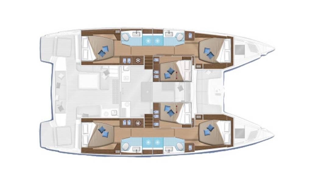Catamaran Lagoon 50 Titti, built in 2022 is anchored in the Marina di Nettuno - Anzio, Lazio, Italy. It has 6 + 1 cabins, can accommodate 12 + 1 people and has 4 + 1 toilets. Bed linen and kitchen equipment are included in the price.