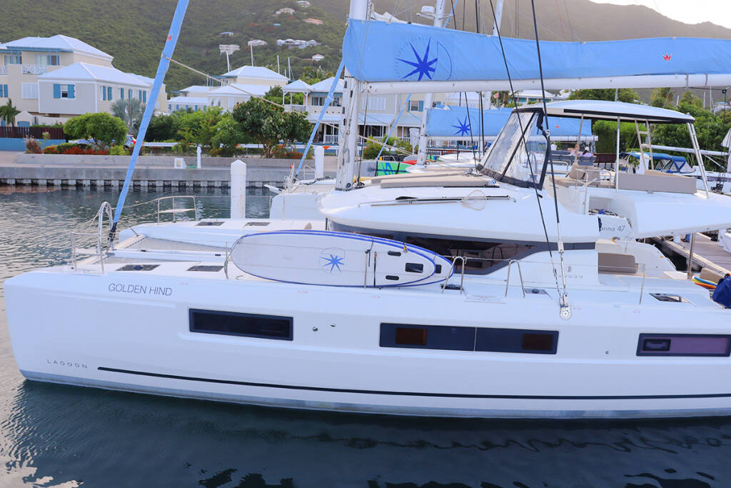 Catamaran Lagoon 51 Golden Hind, built in 2024 is anchored in the BVI, Tortola, Nanny Cay Marina, British Virgin Islands, British Virgin Islands. It has 6 + 1 cabins, can accommodate 12 + 1 people and has 4 + 1 toilets. Bed linen and kitchen equipment are included in the price.