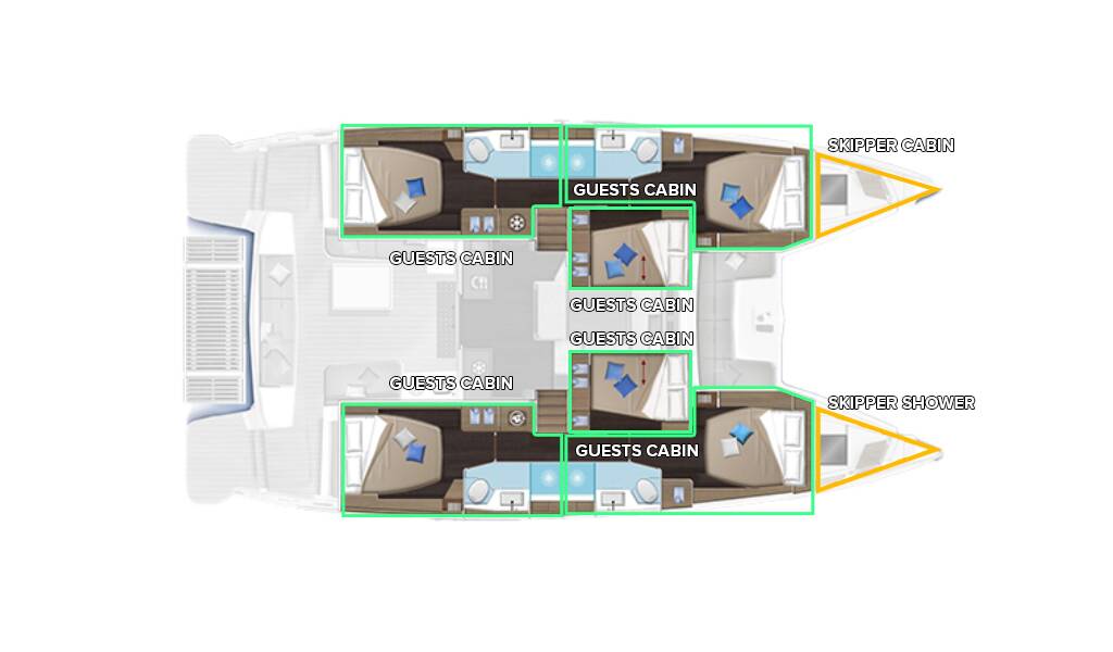 Catamaran Lagoon 51 Lavina, built in 2024 is anchored in the Marina Kastela, Split region, Croatia. It has 6 + 1 cabins, can accommodate 12 + 1 people and has 4 toilets. Bed linen and kitchen equipment are included in the price.