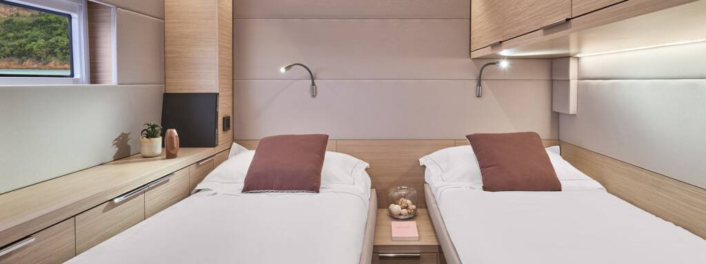Catamaran Lagoon 55 Enki, built in 2025 is anchored in the Fethiye, Yacht Club Mai, Aegean, Turkey. It has 5 + 1 cabins, can accommodate 10 + 2 people and has 5 + 1 toilets. Bed linen and kitchen equipment are included in the price.