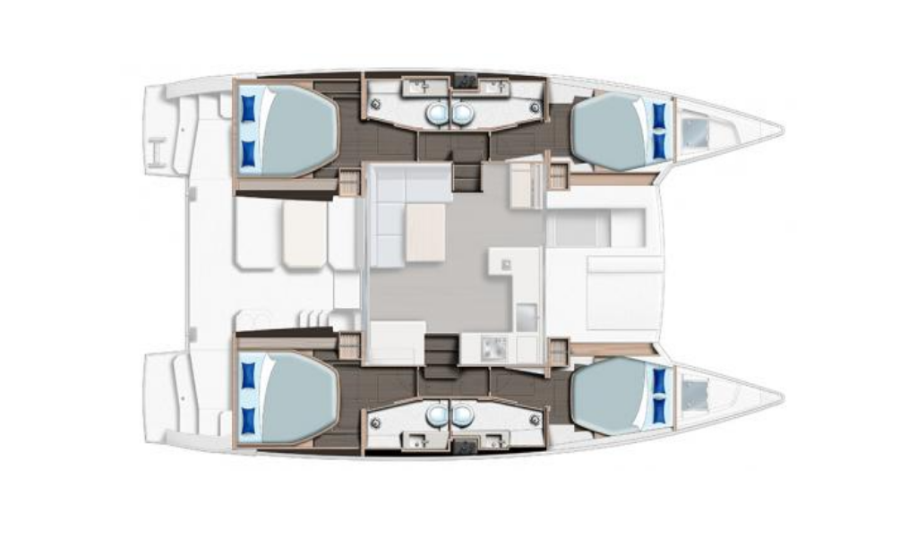 Catamaran Leopard 42 Nicot, built in 2021 is anchored in the Procida, Campania, Italy. It has 4 cabins, can accommodate 8 + 2 people and has 4 toilets. Bed linen and kitchen equipment are included in the price.