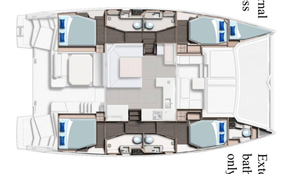 Catamaran Leopard 45 Prince Frederick, built in 2019 is anchored in the Sardinia, Cannigione, Sardinia, Italy. It has 4 + 1 cabins, can accommodate 8 + 2 + 1 people and has 4 + 1 toilets. Bed linen and kitchen equipment are included in the price.