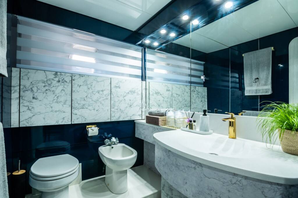 Luxury motor yacht Mangusta 80 Nina, built in 1998 is anchored in the Puerto Banús, Andalusia, Spain. It has 4 cabins, can accommodate 8 + 1 people and has 4 toilets. Bed linen and kitchen equipment are included in the price.