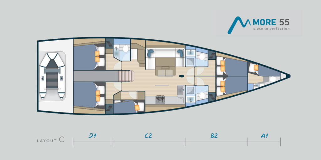 Sailing yacht More 55 Black Pirat - Black Edition, built in 2020 is anchored in the Trogir, Yachtclub Seget (Marina Baotić), Split region, Croatia. It has 5 + 1 cabins, can accommodate 10 + 2 + 1 people and has 3 + 1 toilets. Bed linen and kitchen equipment are included in the price.