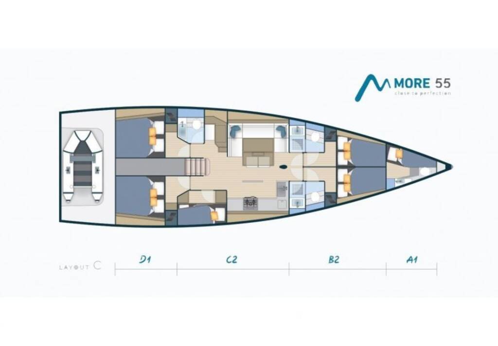 Sailing yacht More 55 Lia of Sweden, built in 2016 is anchored in the Marina Kastela, Split region, Croatia. It has 5 + 1 cabins, can accommodate 10 + 1 + 1 people and has 3 + 1 toilets. Bed linen and kitchen equipment are included in the price.