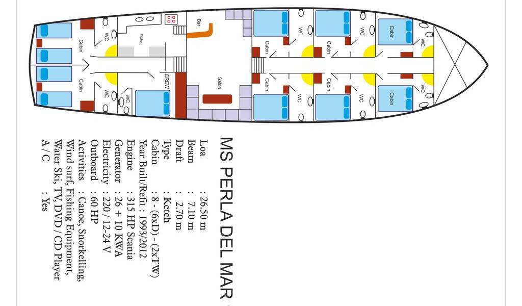 Gulet M/S Perla Del Mar I Perla Del Mar I, built in 1993 is anchored in the Marmaris Yacht Marina, Aegean, Turkey. It has 8 cabins, can accommodate 16 people and has 8 toilets. Bed linen and kitchen equipment are included in the price.