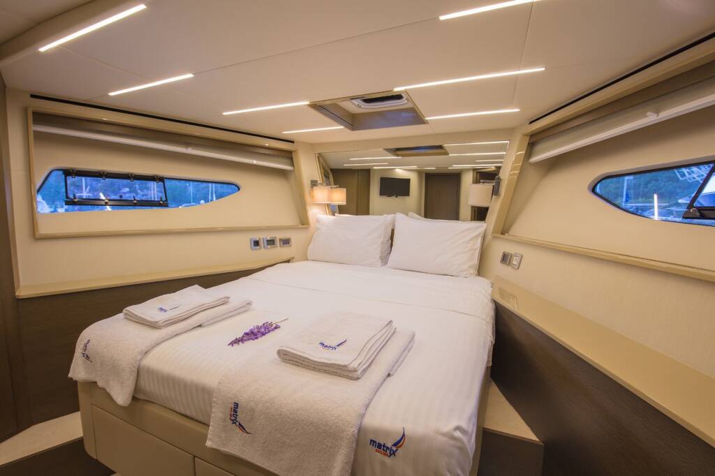 Motor yacht Numarine 62 Journey, built in 2015 is anchored in the Setur Göcek Village Port, Aegean, Turkey. It has 3 + 2 cabins, can accommodate 6 + 2 people and has 3 toilets. Bed linen and kitchen equipment are included in the price.