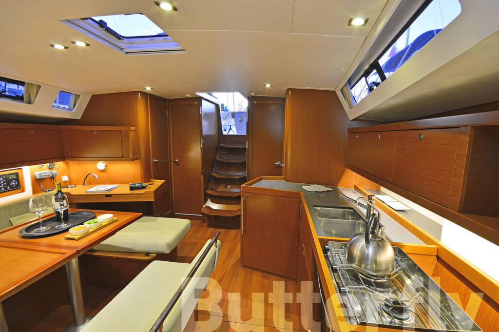 Sailing yacht Oceanis 45 Butterfly, built in 2014 is anchored in the Kos, Kos Marina, Dodecanese, Greece. It has 4 cabins, can accommodate 8 + 2 people and has 2 toilets. Bed linen and kitchen equipment are included in the price.