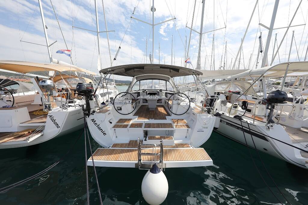 Sailing yacht Oceanis 45 Melanie, built in 2016 is anchored in the Trogir, Marina Trogir (ex.SCT), Split region, Croatia. It has 4 cabins, can accommodate 8 + 2 people and has 2 toilets. Bed linen and kitchen equipment are included in the price.