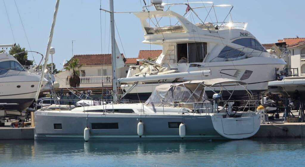 Sailing yacht Oceanis 46.1 Anse Soleil, built in 2023 is anchored in the Marina Frapa, Rogoznica, Šibenik region, Croatia. It has 3 cabins, can accommodate 6 people and has 3 toilets. Bed linen and kitchen equipment are included in the price.