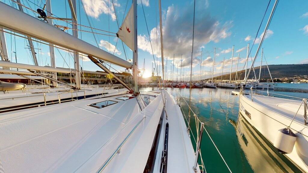 Sailing yacht Oceanis 46.1 Ladybug, built in 2020 is anchored in the Trogir, Marina Trogir (ex.SCT), Split region, Croatia. It has 4 cabins, can accommodate 8 + 2 people and has 4 toilets. Bed linen and kitchen equipment are included in the price.