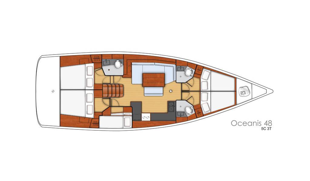 Sailing yacht Oceanis 48 Filomena, built in 2014 is anchored in the Sukosan, D-Marin Dalmacija Marina, Zadar region, Croatia. It has 5 cabins, can accommodate 10 + 1 people and has 3 toilets. Bed linen and kitchen equipment are included in the price.