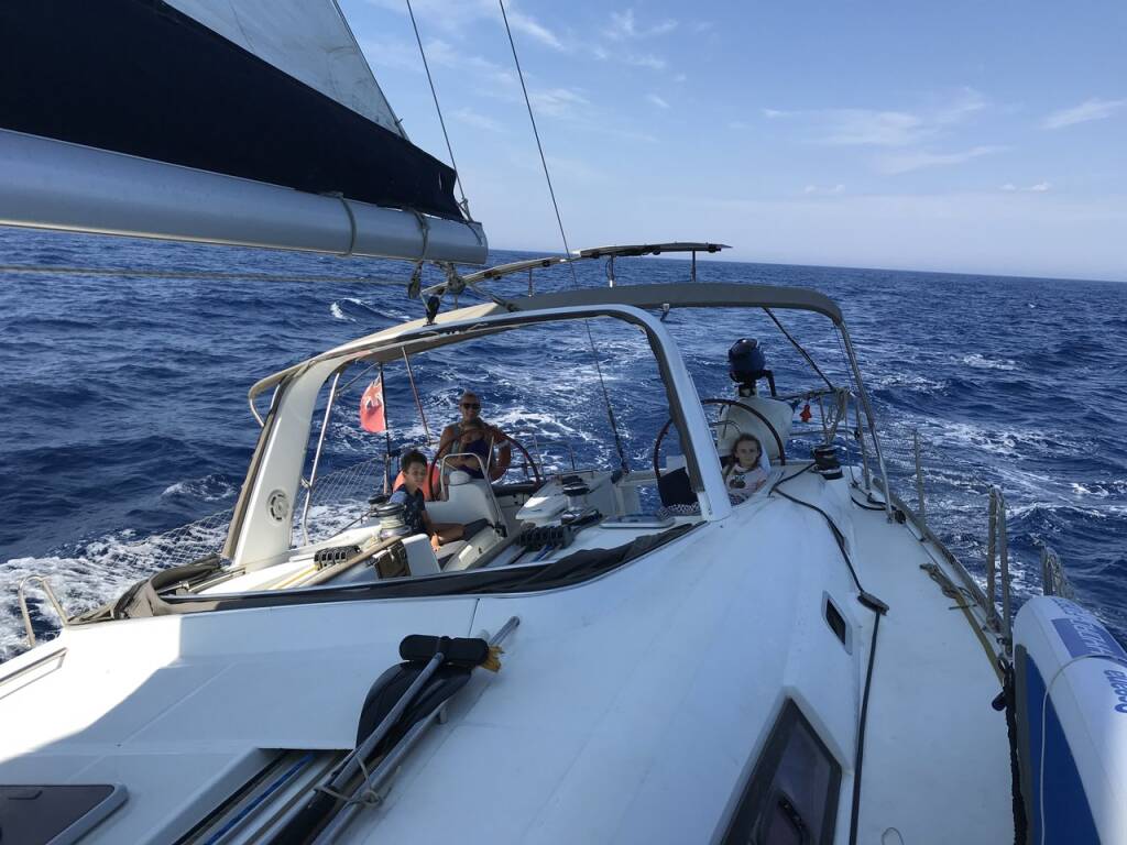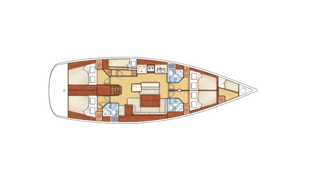 Sailing yacht Oceanis 50 Family Darwin, built in 2010 is anchored in the Palairos, Ionian Islands, Greece. It has 5 + 1 cabins, can accommodate 10 + 1 people and has 3 + 1 toilets. Bed linen and kitchen equipment are included in the price.