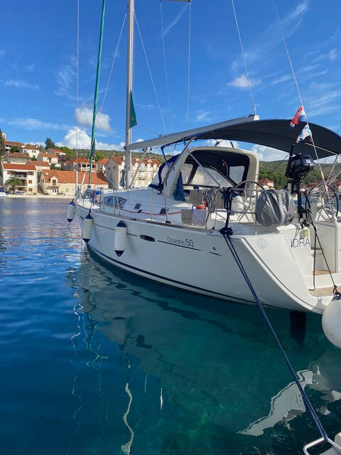 Sailing yacht Oceanis 50 Family Tindra, built in 2011 is anchored in the Brač, Milna, Marina Kanarija, Split region, Croatia. It has 5 + 1 cabins, can accommodate 10 + 2 + 1 people and has 3 + 1 toilets. Bed linen and kitchen equipment are included in the price.