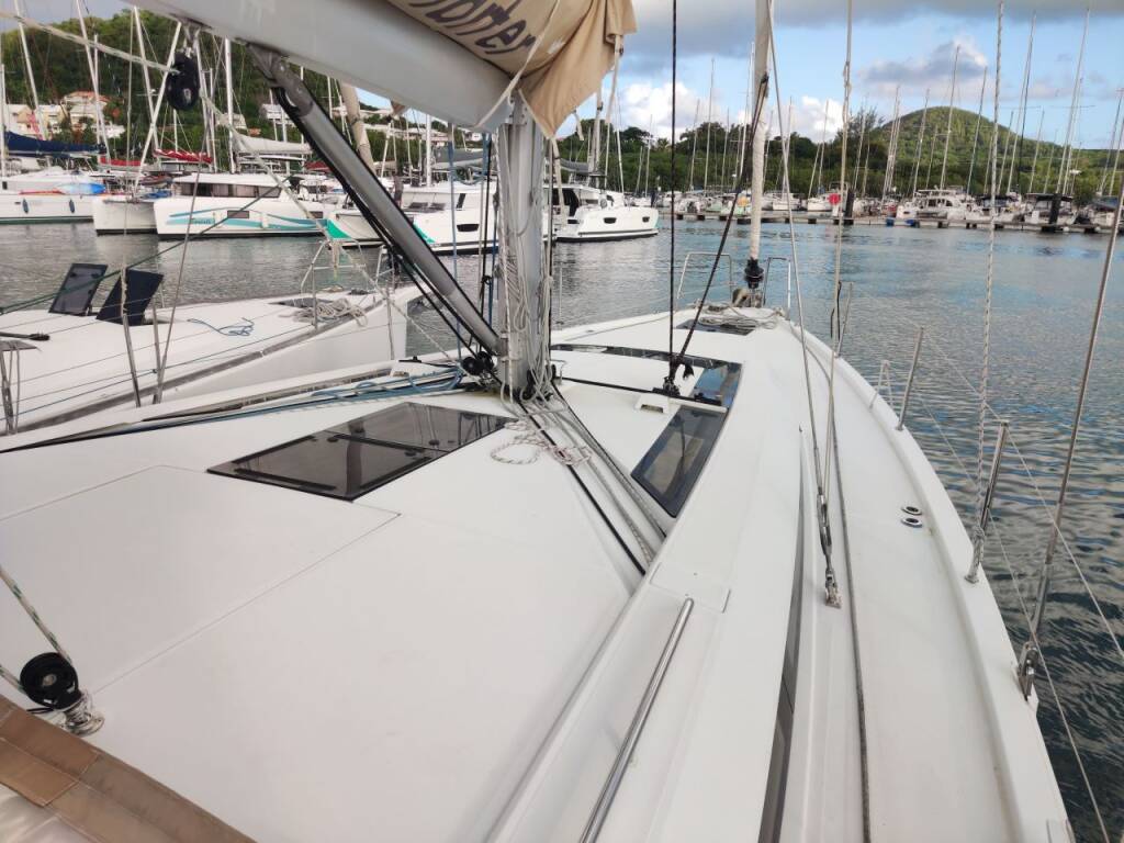 Sailing yacht Oceanis 51.1 KLIMT, built in 2019 is anchored in the Martinique, Le Marin, Martinique, Caribbean. It has 5 + 1 cabins, can accommodate 10 + 2 + 1 people and has 3 + 1 toilets. Bed linen and kitchen equipment are included in the price.