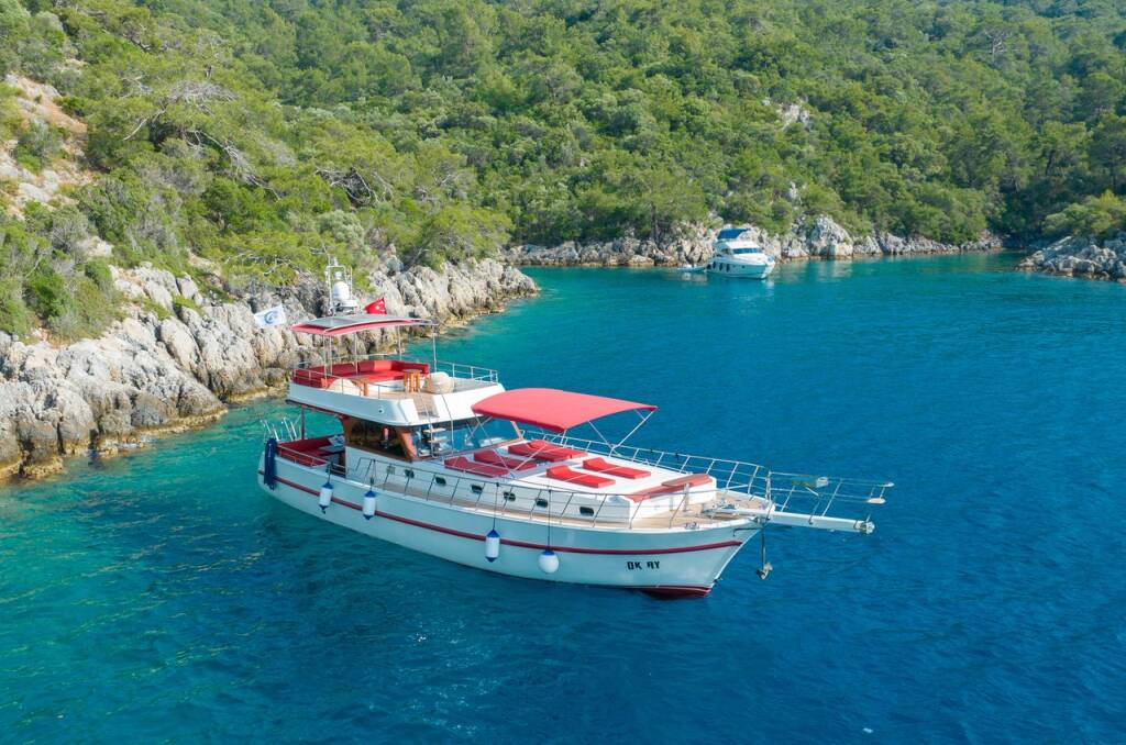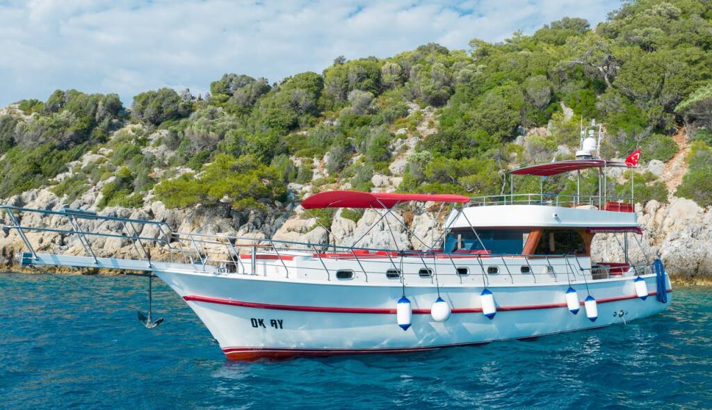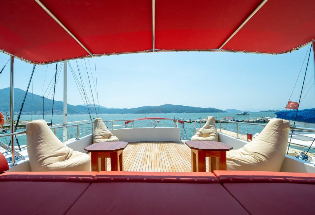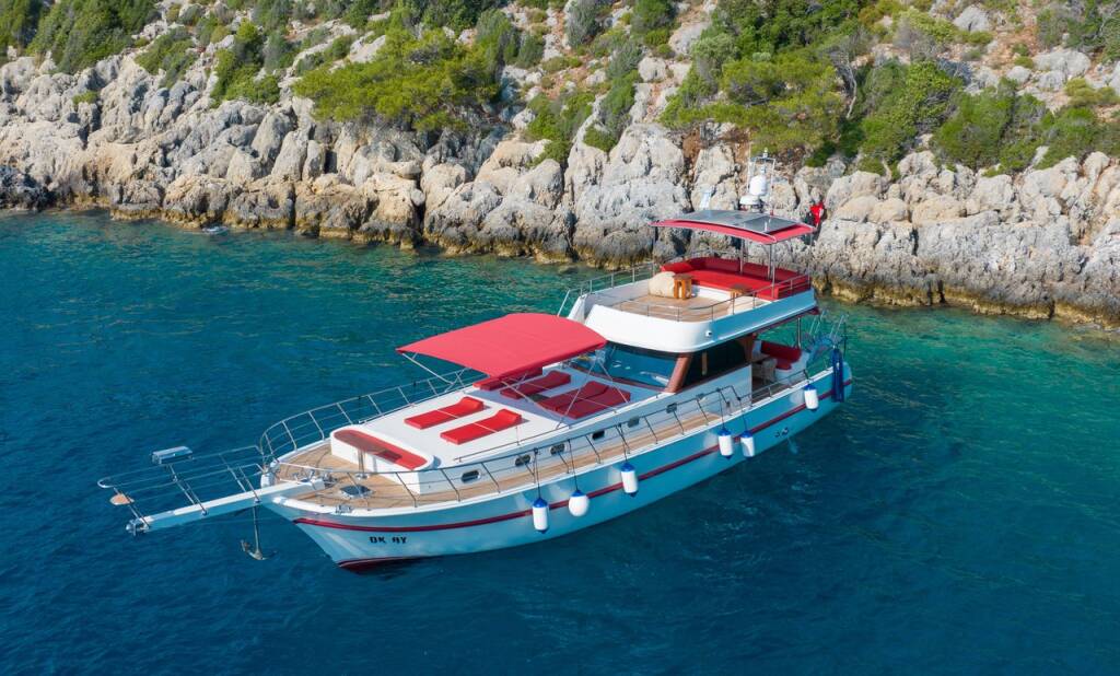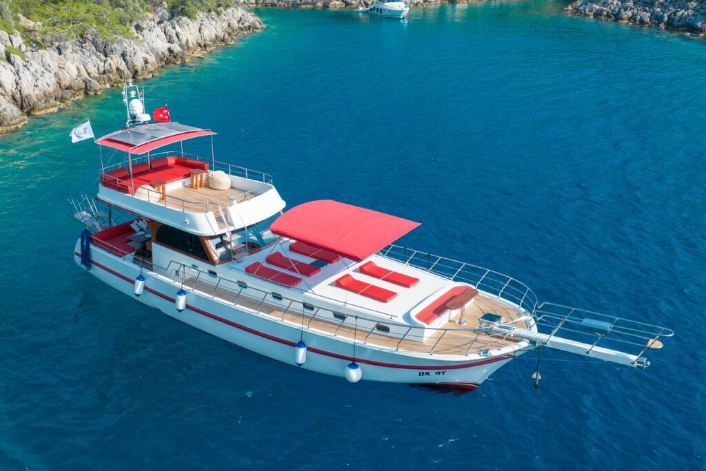 Motor yacht OK AY Gulet Ok Ay, built in 2023 is anchored in the Fethiye, Ece Saray Marina Resort, Aegean, Turkey. It has 3 cabins, can accommodate 6 people and has 3 toilets. Bed linen and kitchen equipment are included in the price.
