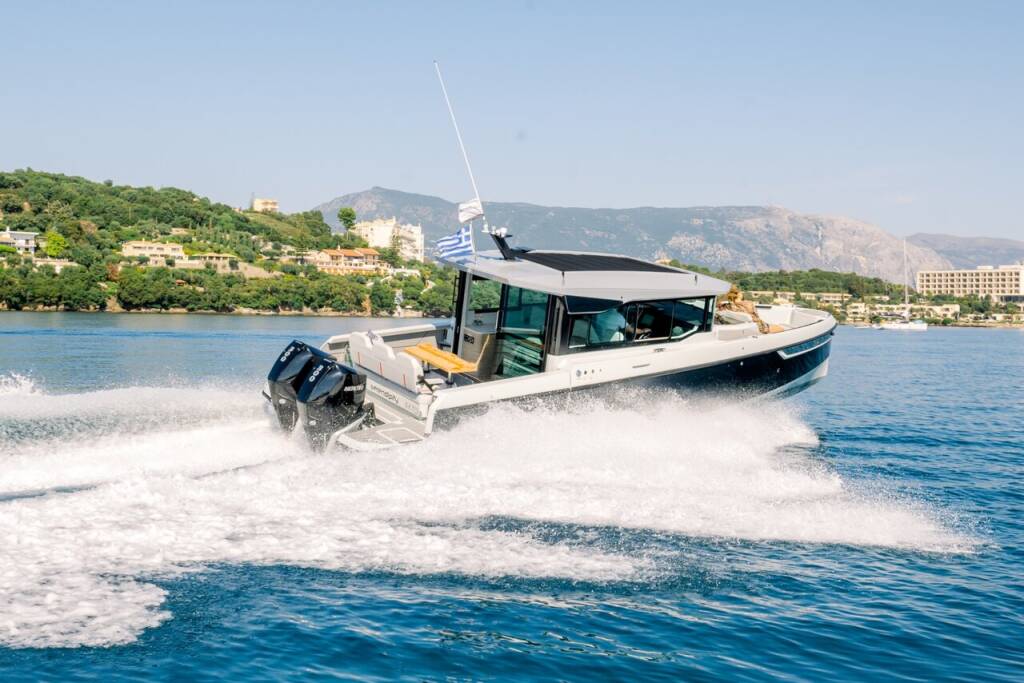 Motor boat Saxdor 320 GTC Serendipity, built in 2022 is anchored in the Corfu, Gouvia Marina, Ionian Islands, Greece. It has 1 cabins, can accommodate 2 + 2 people and has 1 toilets. Bed linen and kitchen equipment are included in the price.