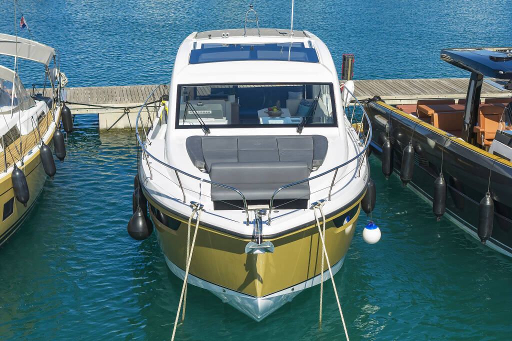 Motor yacht Sealine C390 Tireless, built in 2024 is anchored in the Marina Kastela, Split region, Croatia. It has 3 cabins, can accommodate 6 + 2 people and has 2 toilets. Bed linen and kitchen equipment are included in the price.