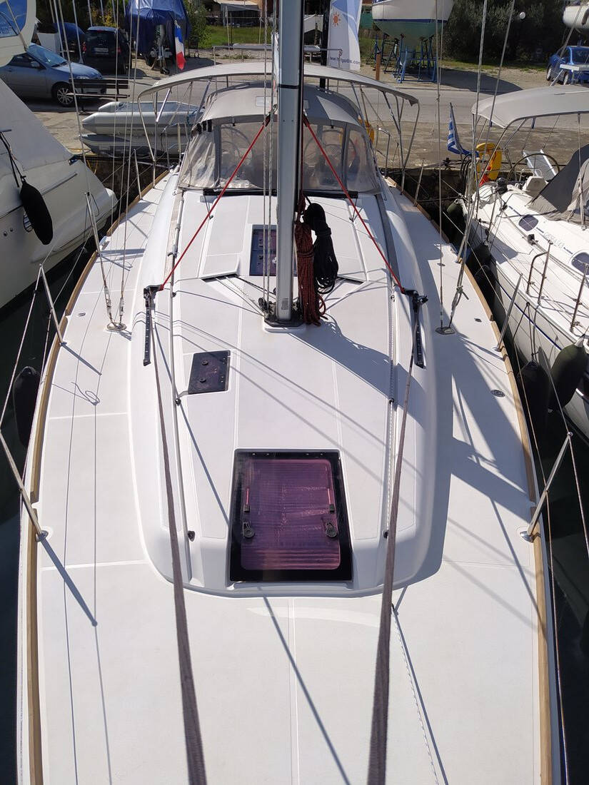 Sailing yacht Sun Odyssey 409 Traveller, built in 2013 is anchored in the Corfu, Gouvia Marina, Ionian Islands, Greece. It has 3 cabins, can accommodate 6 + 2 people and has 2 toilets. Bed linen and kitchen equipment are included in the price.