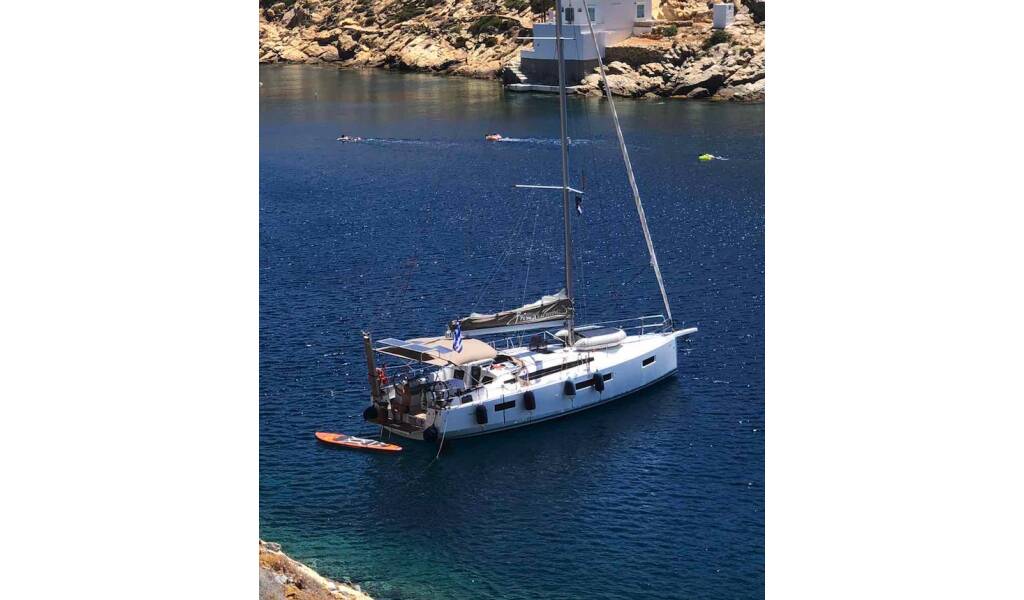 Sailing yacht Sun Odyssey 410 Aquaholic, built in 2019 is anchored in the Athens, Alimos marina, Athens area/Saronic/Peloponese, Greece. It has 3 cabins, can accommodate 6 + 2 people and has 2 toilets. Bed linen and kitchen equipment are included in the price.