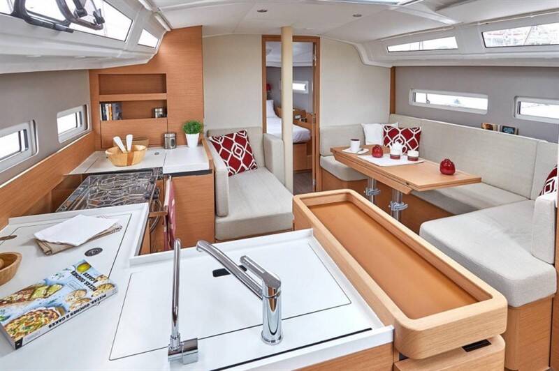 Sailing yacht Sun Odyssey 410 Elcano, built in 2020 is anchored in the Lefkas, D-Marin, Ionian Islands, Greece. It has 3 cabins, can accommodate 6 people and has 2 toilets. Bed linen and kitchen equipment are included in the price.