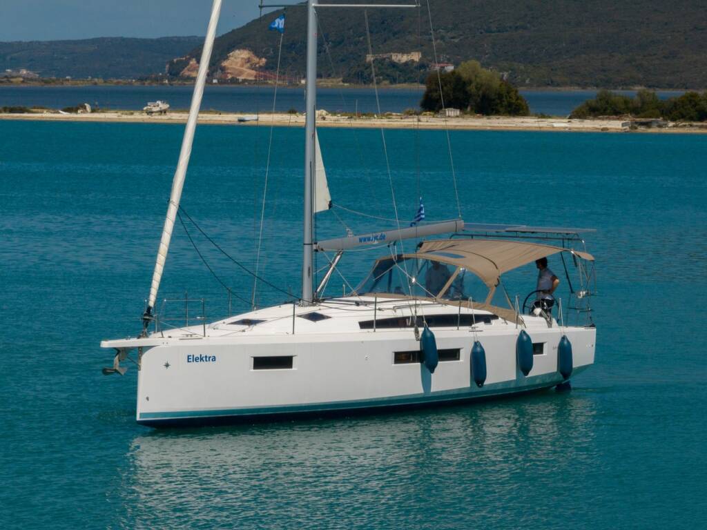 Sailing yacht Sun Odyssey 410 Elektra, built in 2022 is anchored in the Lefkas main port, Ionian Islands, Greece. It has 3 cabins, can accommodate 6 + 2 people and has 2 toilets. Bed linen and kitchen equipment are included in the price.