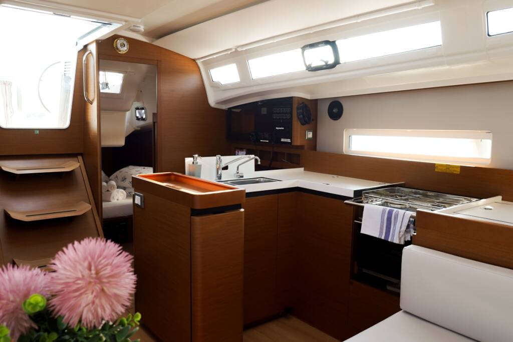 Sailing yacht Sun Odyssey 410 Evelyne, built in 2022 is anchored in the Marina Pirovac, Šibenik region, Croatia. It has 3 cabins, can accommodate 6 + 1 people and has 2 toilets. Bed linen and kitchen equipment are included in the price.
