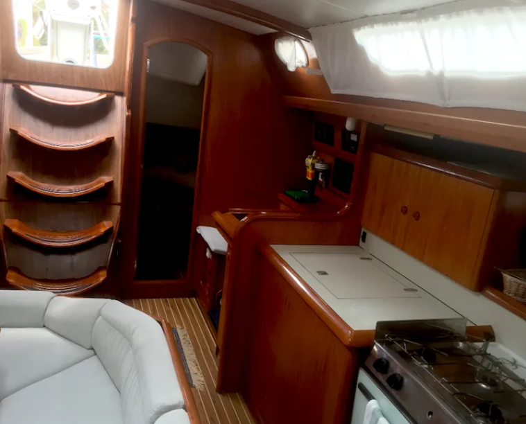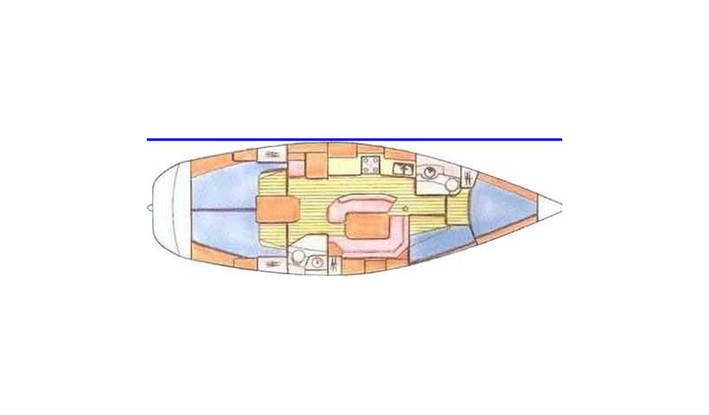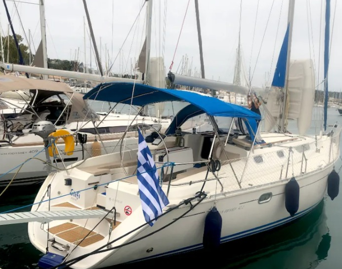 Sailing yacht Sun Odyssey 42.2 Stefi, built in 1996 is anchored in the Corfu, Gouvia Marina, Ionian Islands, Greece. It has 4 cabins, can accommodate 8 people and has 2 toilets. Bed linen and kitchen equipment are included in the price.