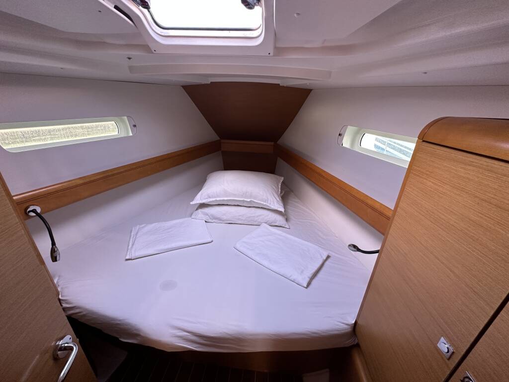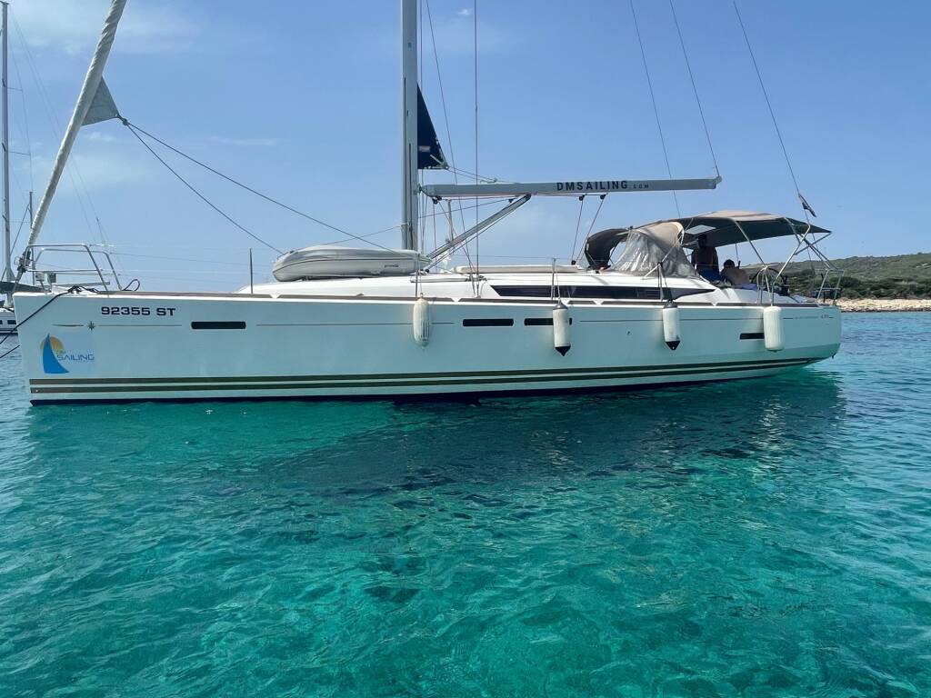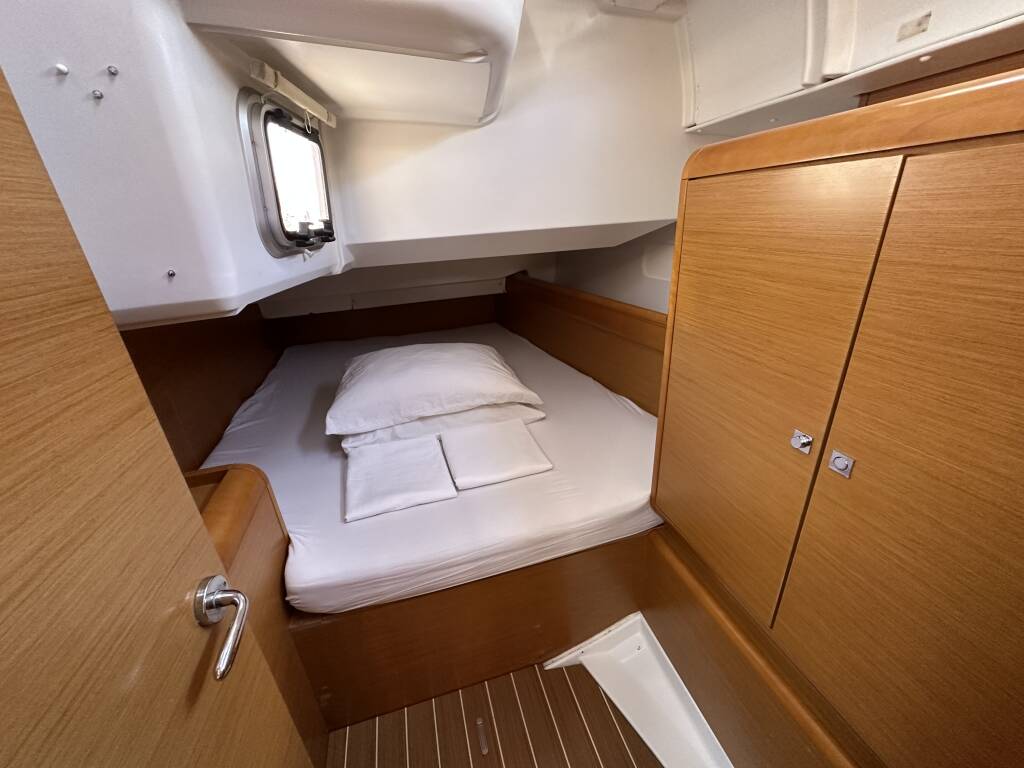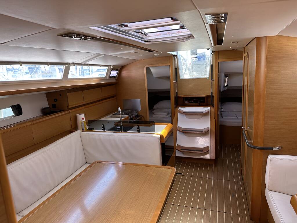 Sailing yacht Sun Odyssey 439 Aura, built in 2012 is anchored in the ACI Marina Split, Split region, Croatia. It has 4 cabins, can accommodate 8 + 2 people and has 2 toilets. Bed linen and kitchen equipment are included in the price.