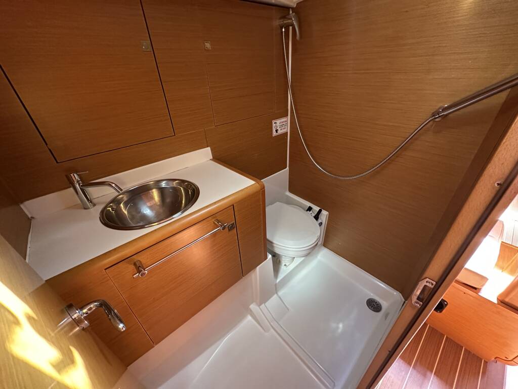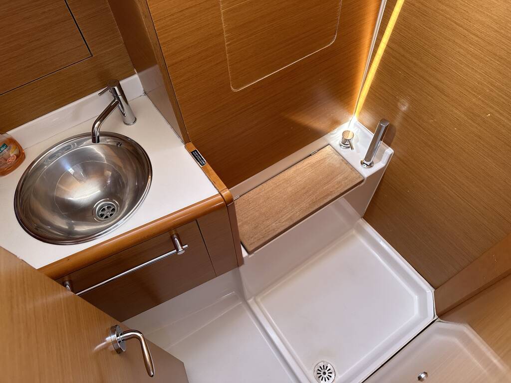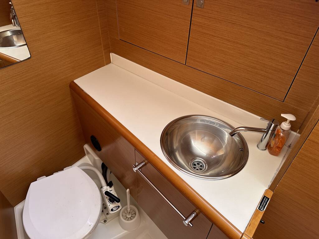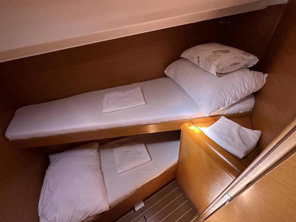 Sailing yacht Sun Odyssey 439 Aura, built in 2012 is anchored in the ACI Marina Split, Split region, Croatia. It has 4 cabins, can accommodate 8 + 2 people and has 2 toilets. Bed linen and kitchen equipment are included in the price.