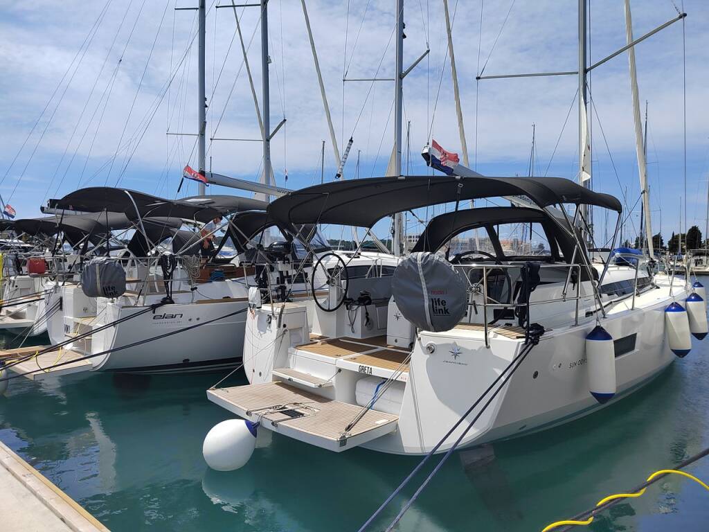 Sailing yacht Sun Odyssey 440 Greta, built in 2024 is anchored in the Pula, Marina Polesana, Istra, Croatia. It has 4 cabins, can accommodate 8 people and has 2 toilets. Bed linen and kitchen equipment are included in the price.