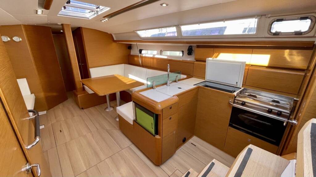 Sailing yacht Sun Odyssey 449 Amelie, built in 2017 is anchored in the Corfu, Gouvia Marina, Ionian Islands, Greece. It has 4 cabins, can accommodate 8 + 2 people and has 2 toilets. Bed linen and kitchen equipment are included in the price.